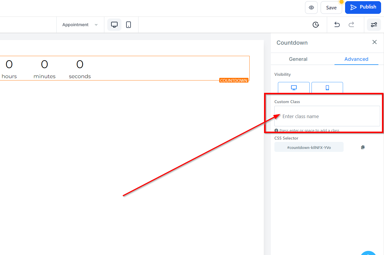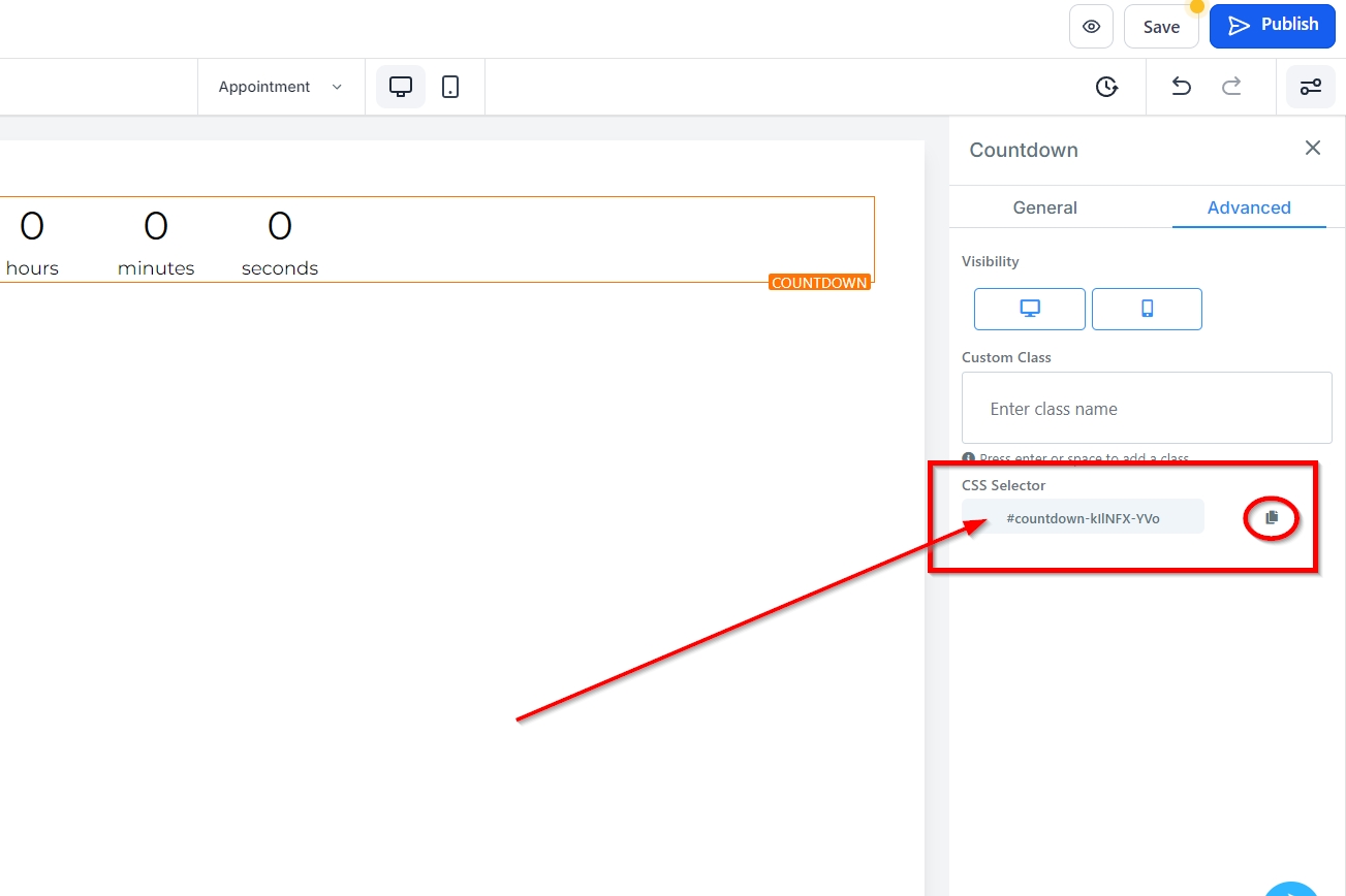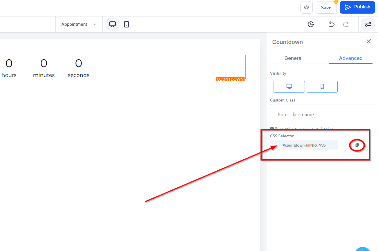 The CSS Selector feature offers the ability to copy custom CSS code by clicking on the Copy icon located on the right side of the reference code.