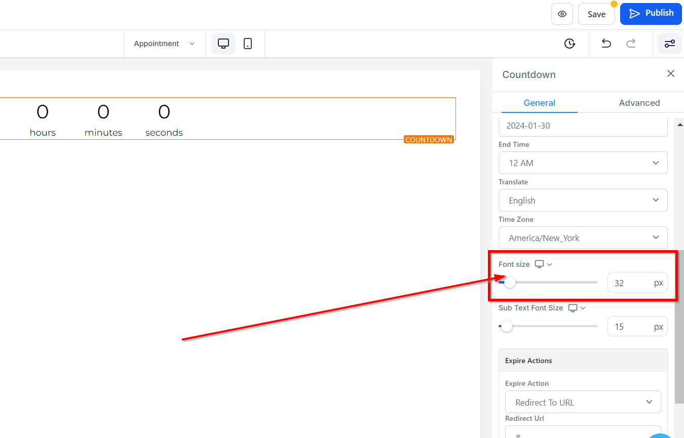 In order to adjust the font size of your countdown timer for both mobile and desktop devices, you can use the Mobile and Desktop Font Size feature. Simply drag the size bars to increase or decrease the font size as needed. This feature also supports Markdown formatting, enabling further customization options.