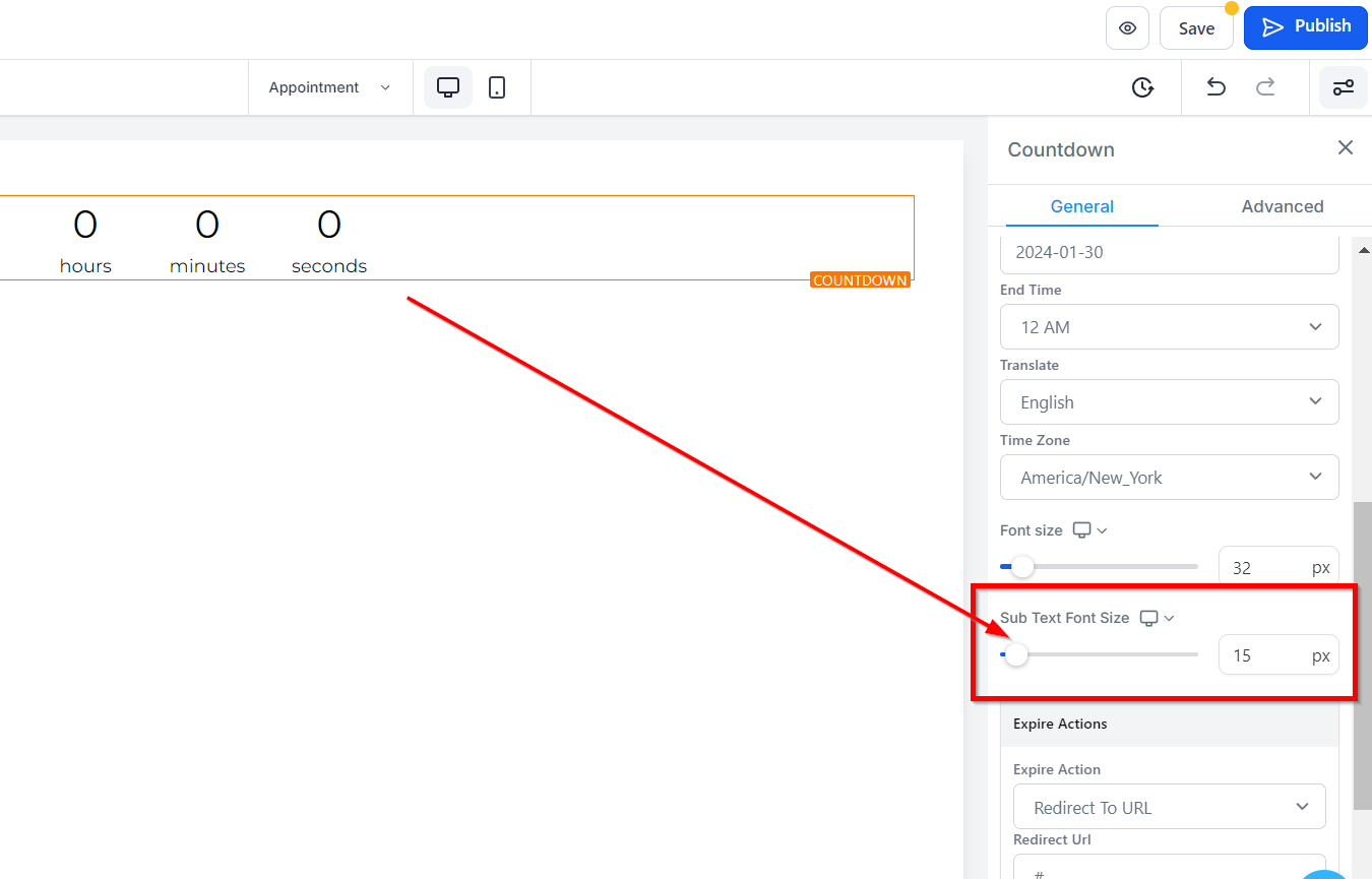 To customize the font size for the subtext of your countdown timer on both desktop and mobile devices, use the Desktop and Mobile Subtext Font Size feature. This feature allows you to adjust the font size by dragging and adjusting the size bars as needed. You can also use Markdown formatting to customize the style of your subtext font.