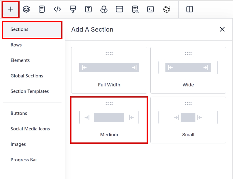 3. Add a New Section: To add a new section, choose "Medium" and then select "Row". Opt for a single column layout.