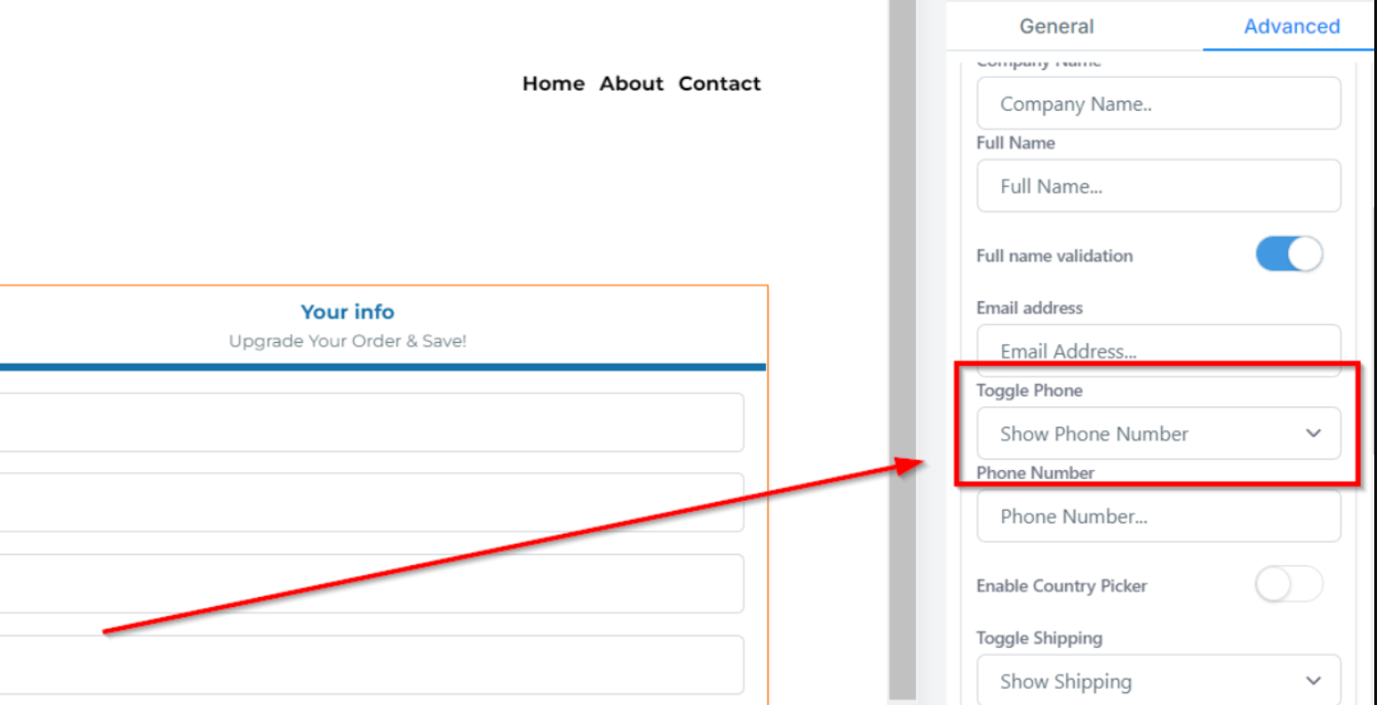 For removing the phone number field, select "Toggle Phone".