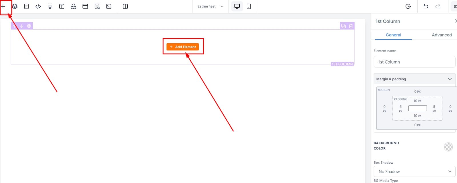 Another way to add Elements is by clicking on the (+) icon that appears when you place your cursor on the Element space (ORANGE box).