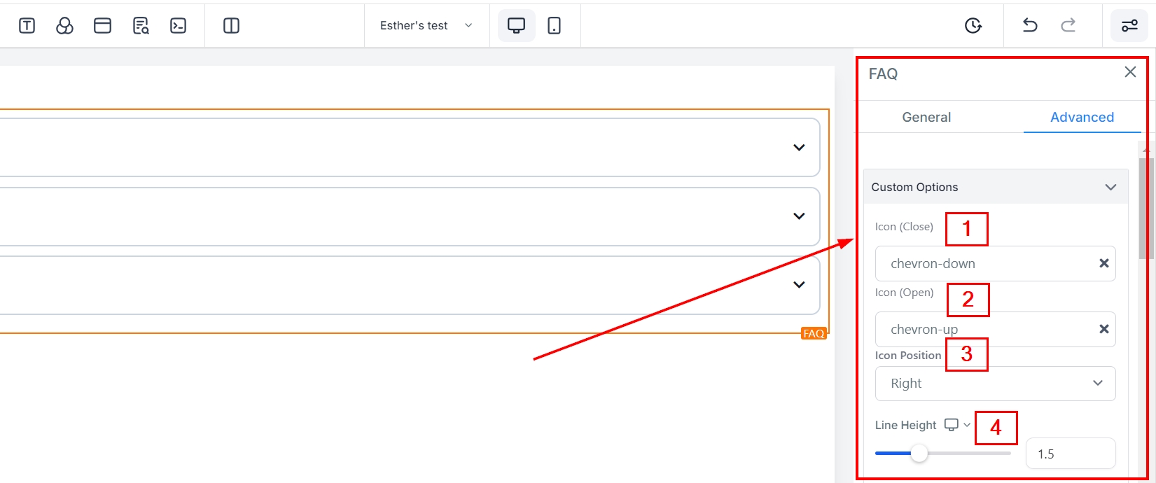 You can add an icon to your page by simply selecting from the available icon. If you have the desired icon in mind, you can type it into the search bar to narrow down the options. Here the Icon used when the list's drop-down menu is Open is "Chevron-up".