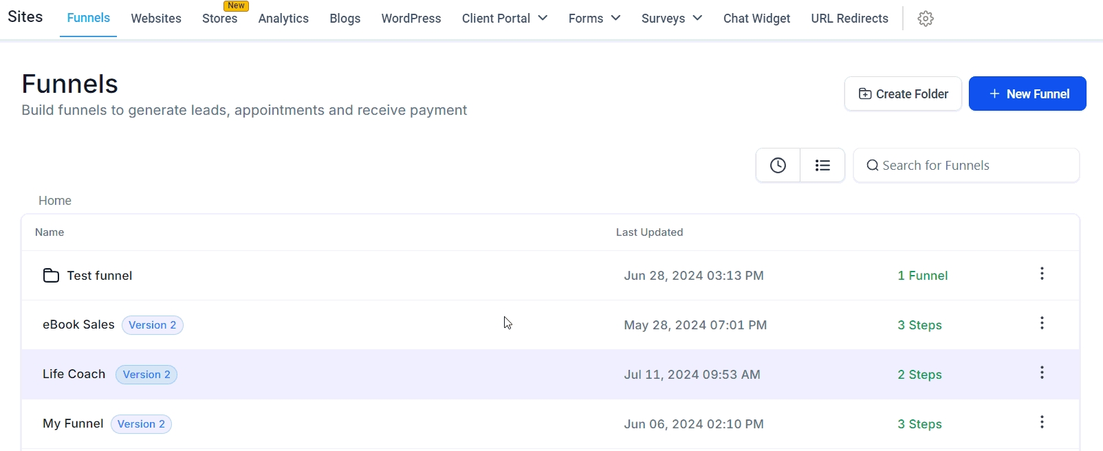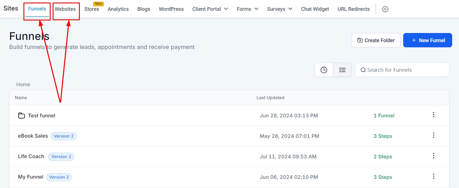 Navigate to Funnels: From the left-hand menu, click on Sites and select the Funnels or Websites tab. In this guide, we will create a funnel.