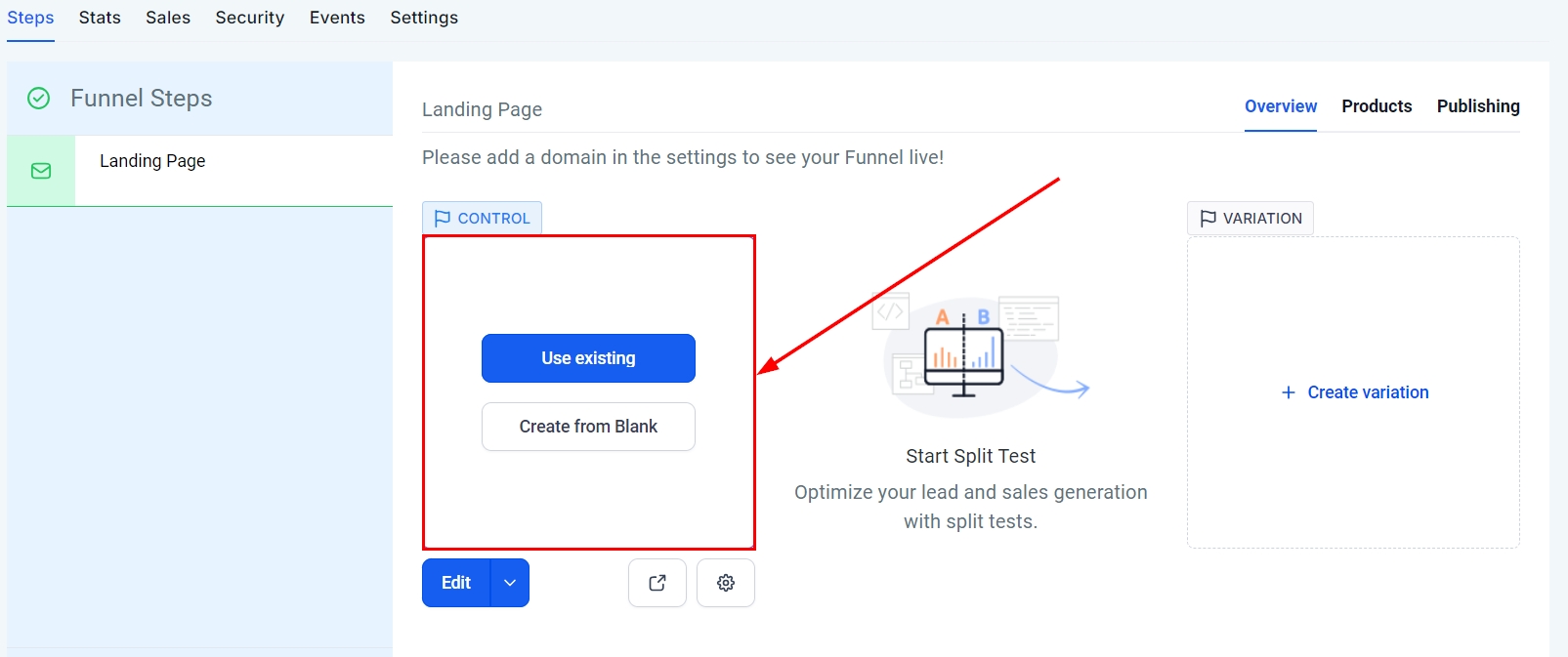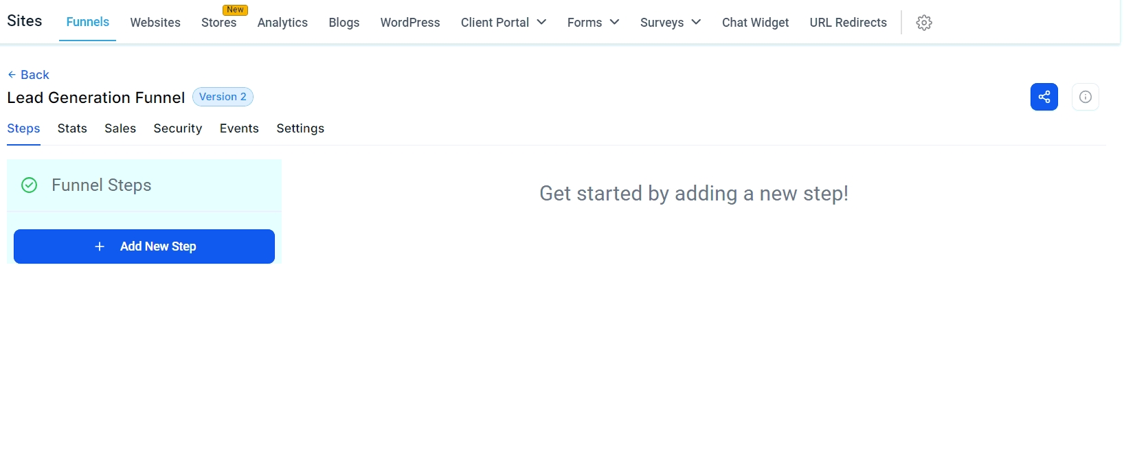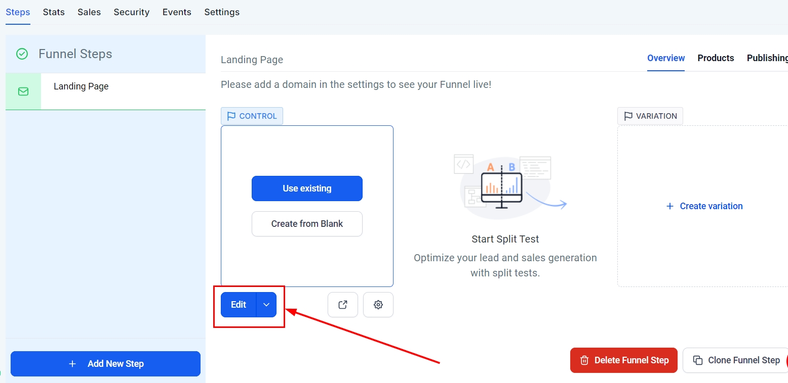Add Step: Click + Add New Step to start adding pages to your funnel.