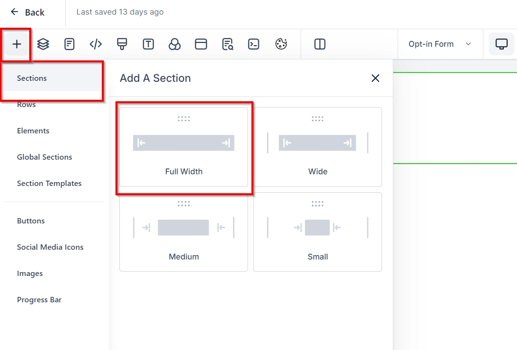 Begin by adding a full-width section to your funnel page. This will serve as the container for your pricing columns.