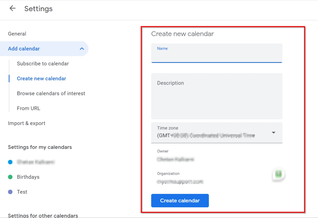 Name your calendar (e.g., "Company Events") and ensure the correct time zone is selected to avoid scheduling conflicts.