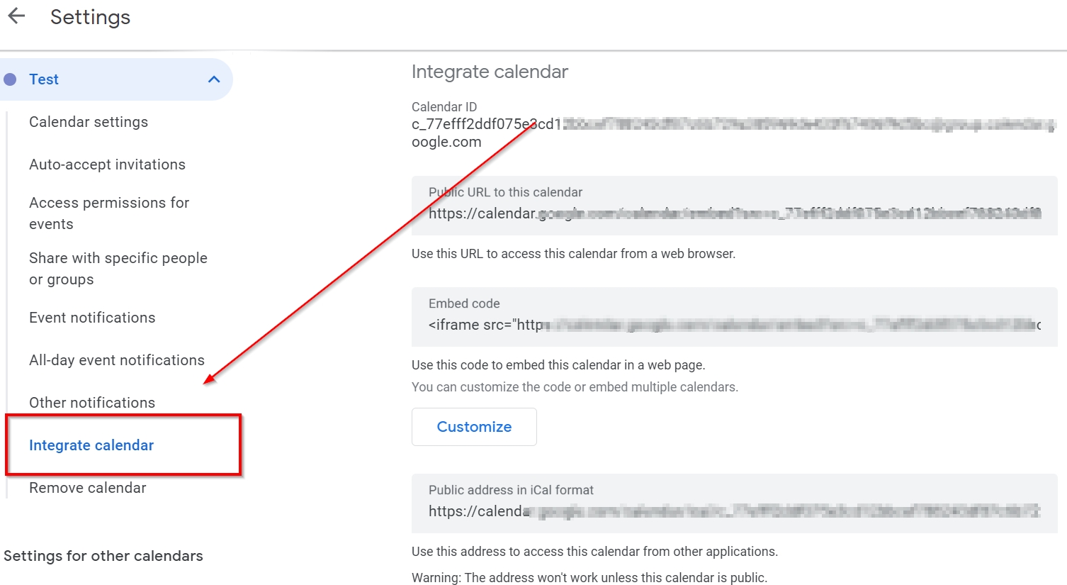 In Google Calendar settings, find your calendar under "Settings for my calendars," select "Integrate calendar," and copy the embed code provided.