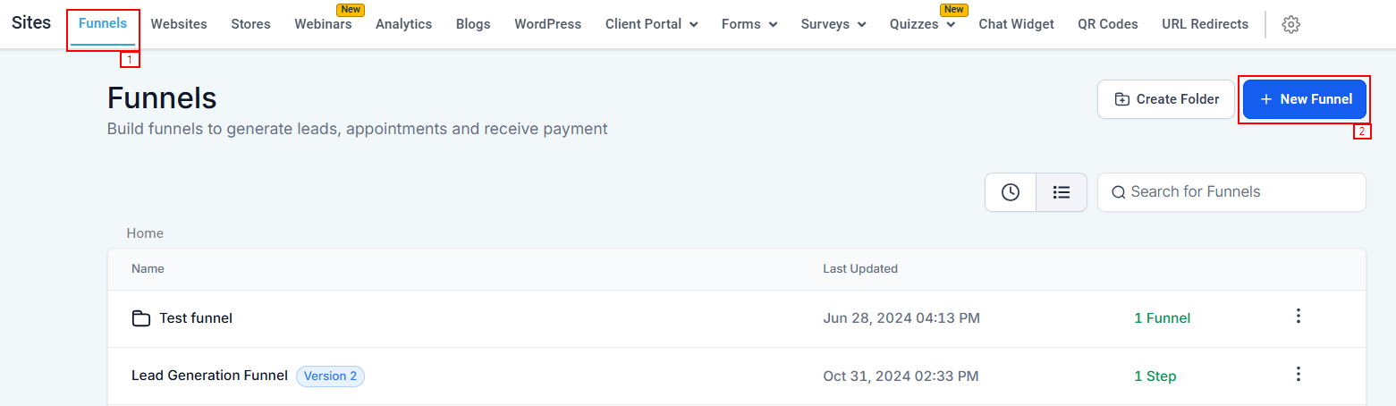 To get started, navigate to the Sites section in your CRM, and click on the Funnels. Click on “+ New Funnel” to initiate the process and start building or importing a funnel.