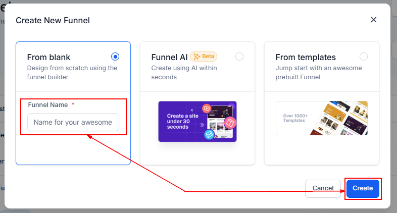 You can create from blank, use Funnel AI, or a prebuilt template. If you opt to create from scratch, enter a name for your funnel and hit “Create.”