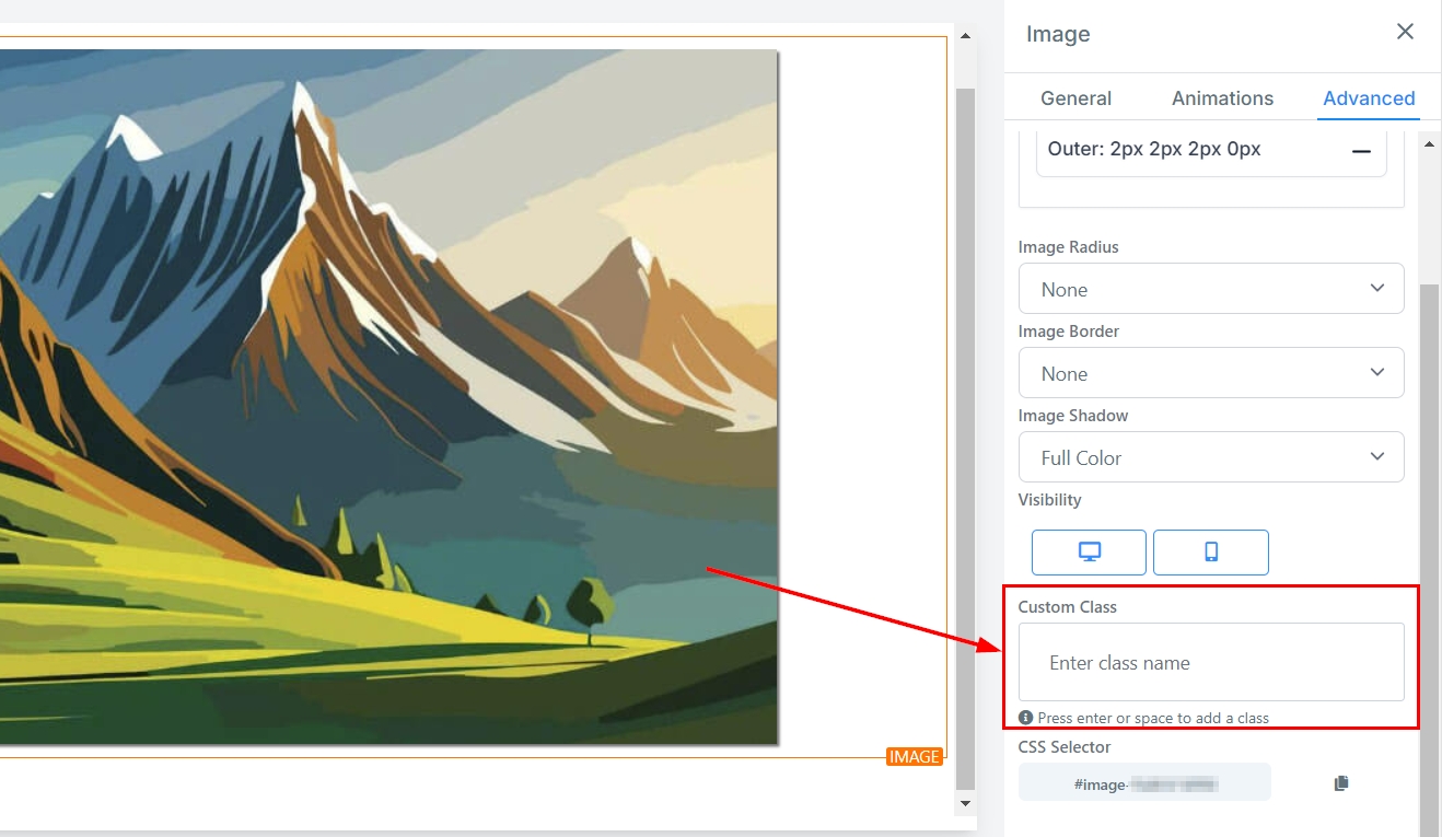 Under the Advanced Settings tab, you have additional customization options such as adding border-radius, adjusting visibility, adding a custom class, and copying the CSS code for later use.