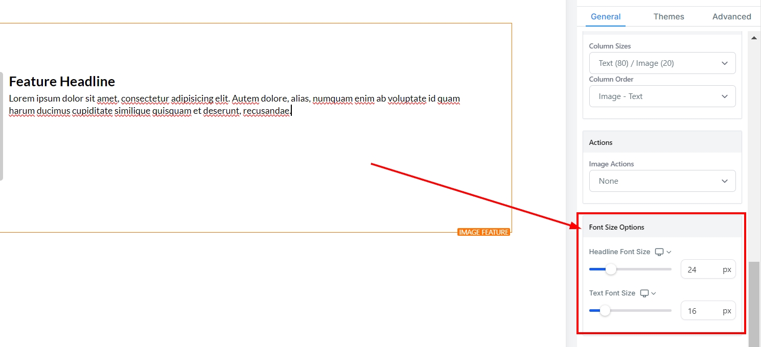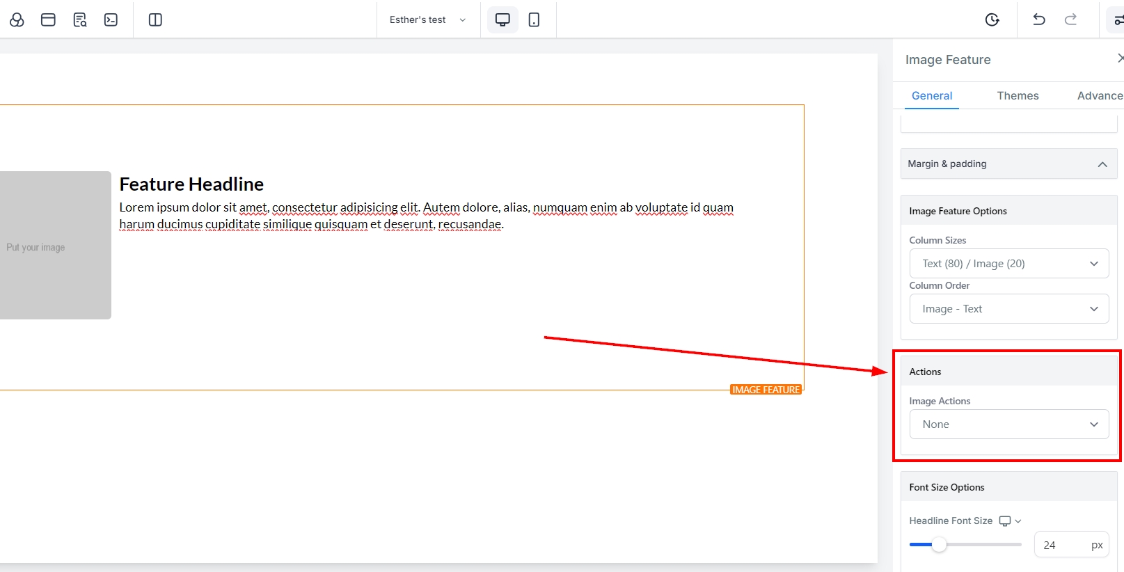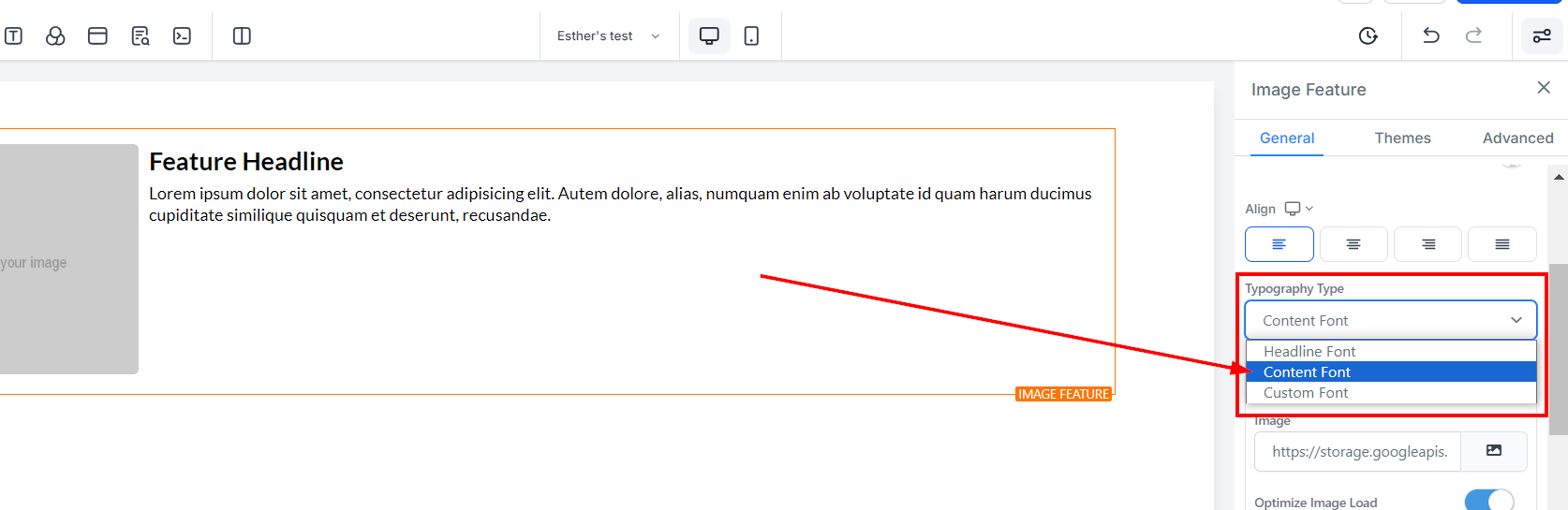 The Image Feature element allows you to add an image with a headline and text element. Utilize this option when adding team member highlights or product/service highlights to your funnel and website pages. On the left-hand side of the page, you will see various customization options for your Image Feature that we will review here.