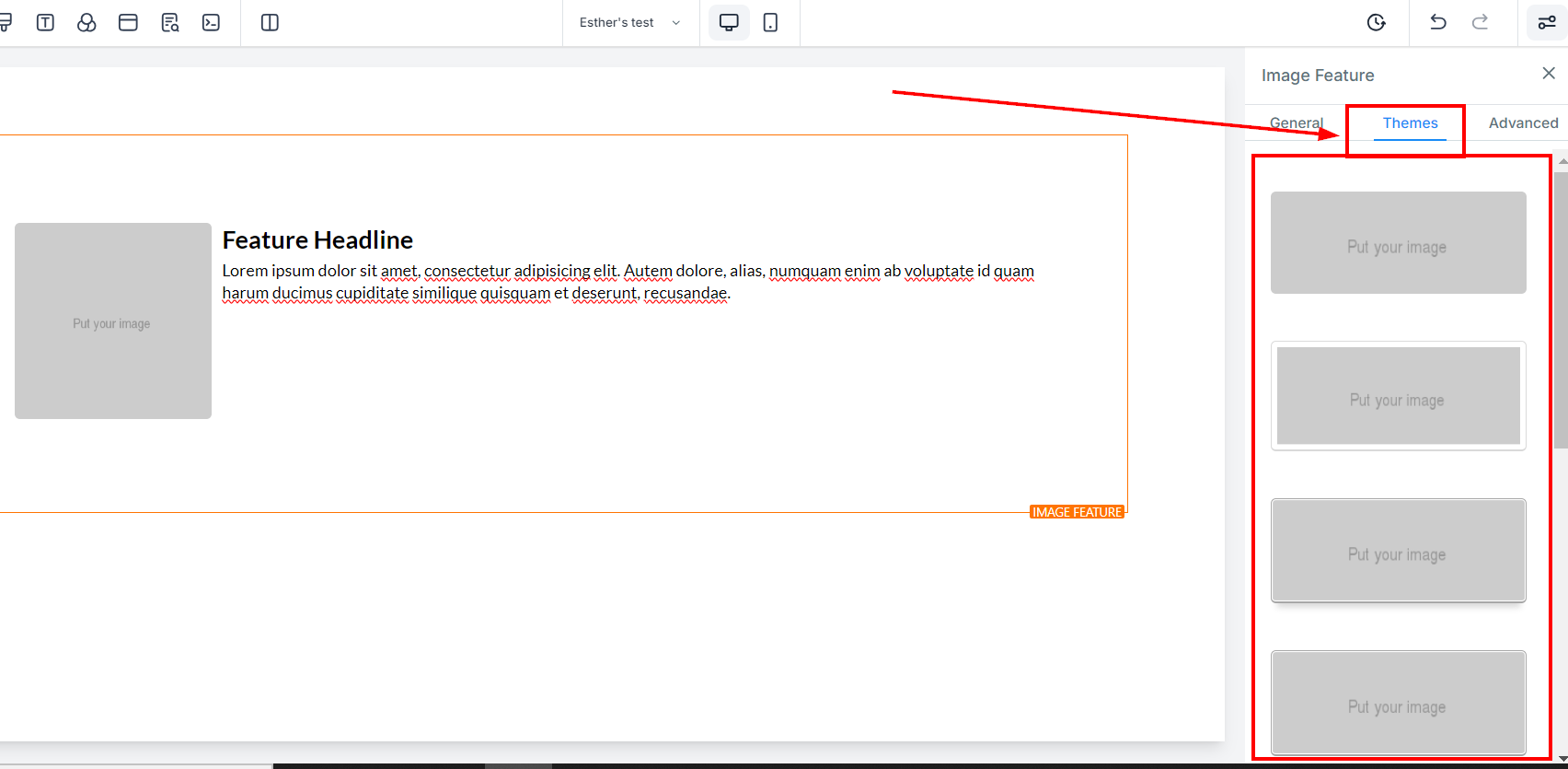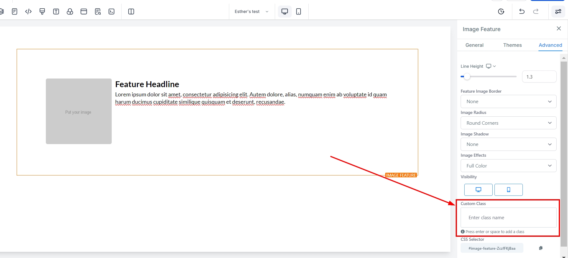 To add an icon to your Image Feature, simply select from the list of available icons. If you have a specific icon in mind, you can type it into the search bar to narrow down the options. This icon will appear next to the image feature headline text.