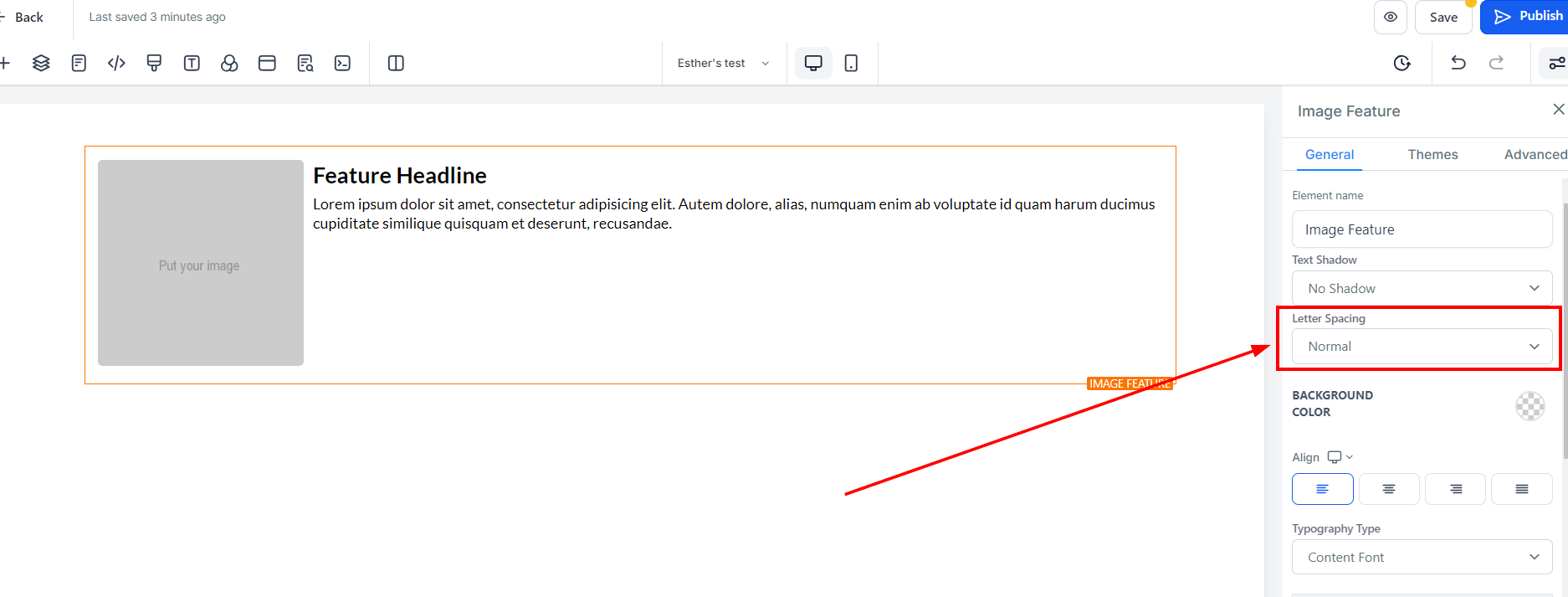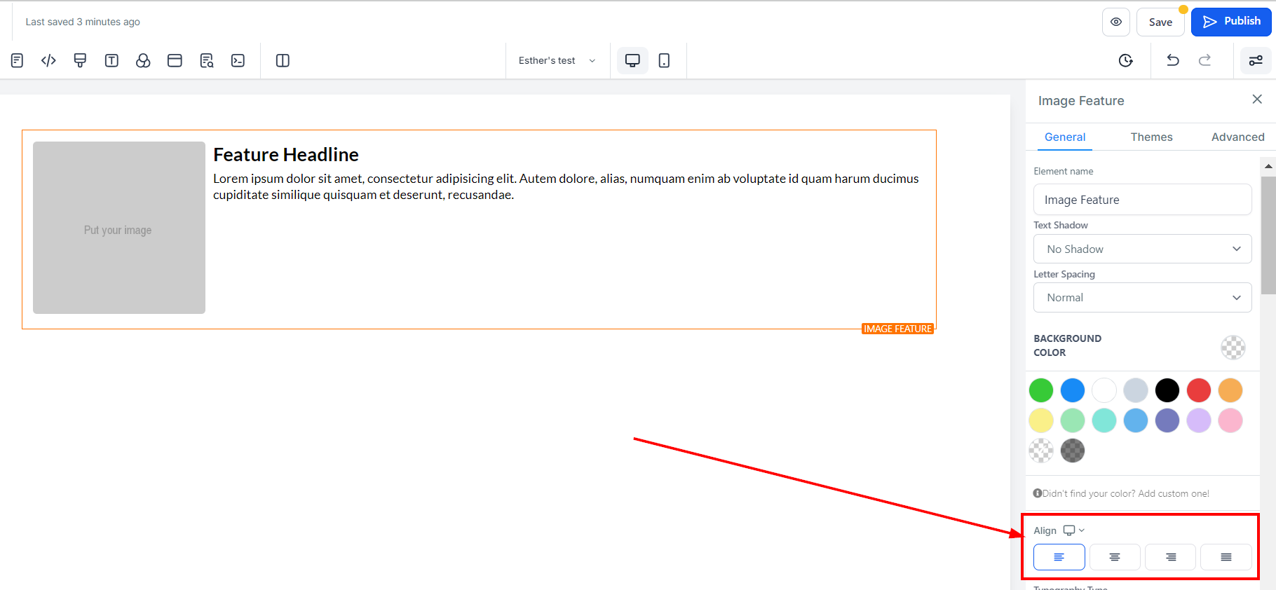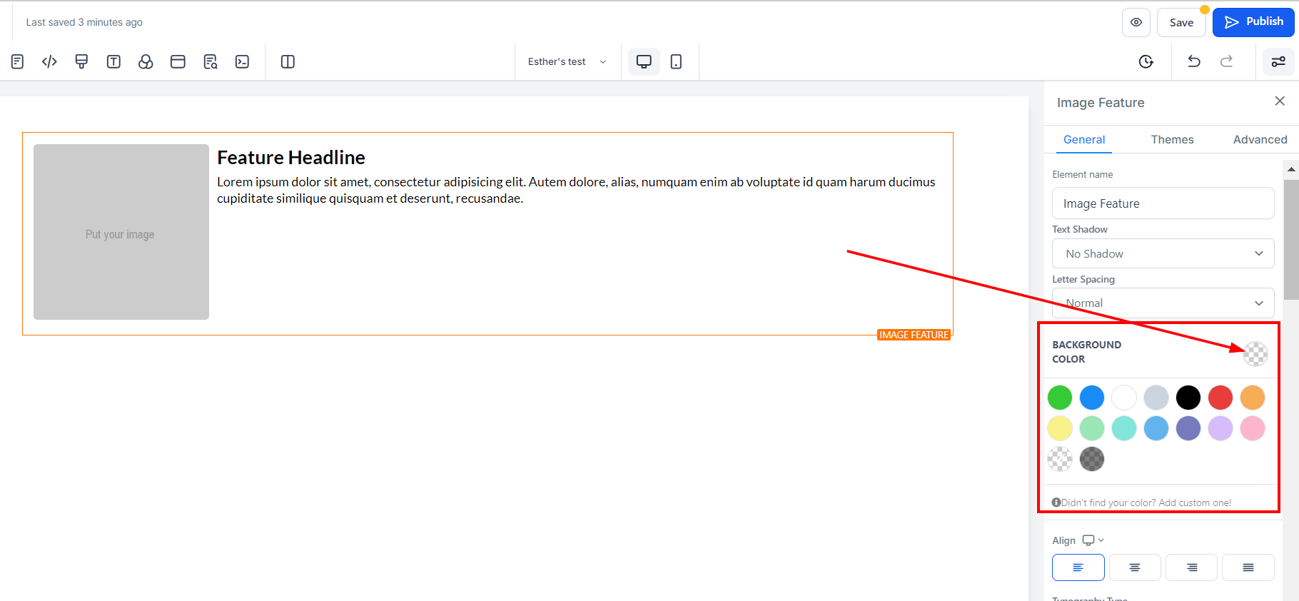To modify the background color of your Image feature, select the content you wish to adjust and click on it.