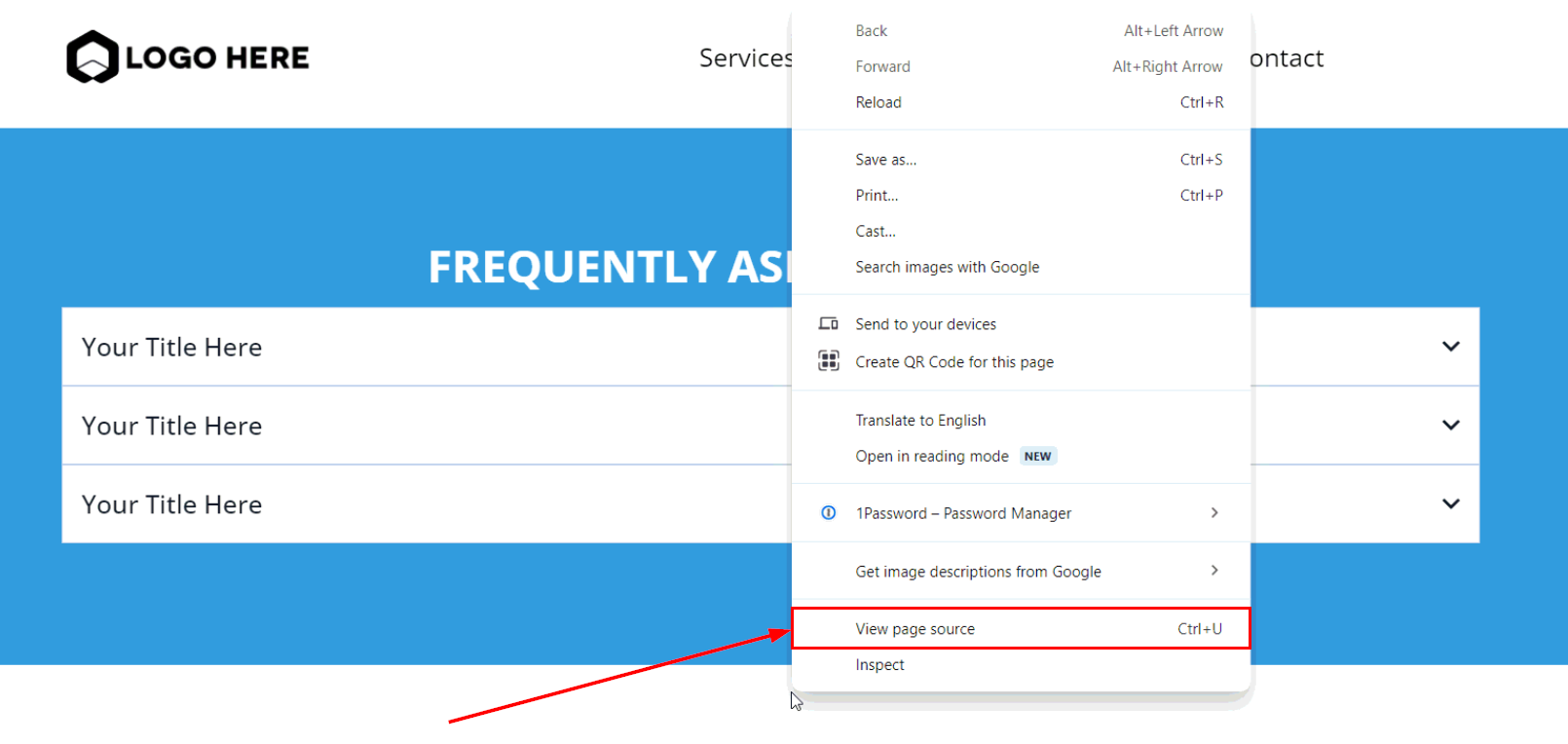 2. View Source Code: Right-click on the page background and select "View Page Source" from the context menu to open the HTML source code of your page.