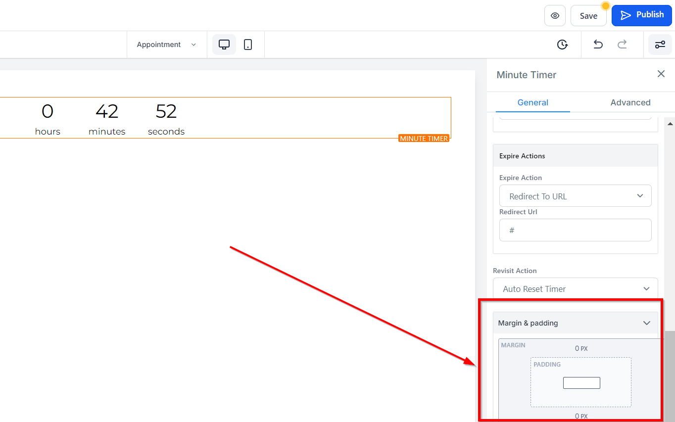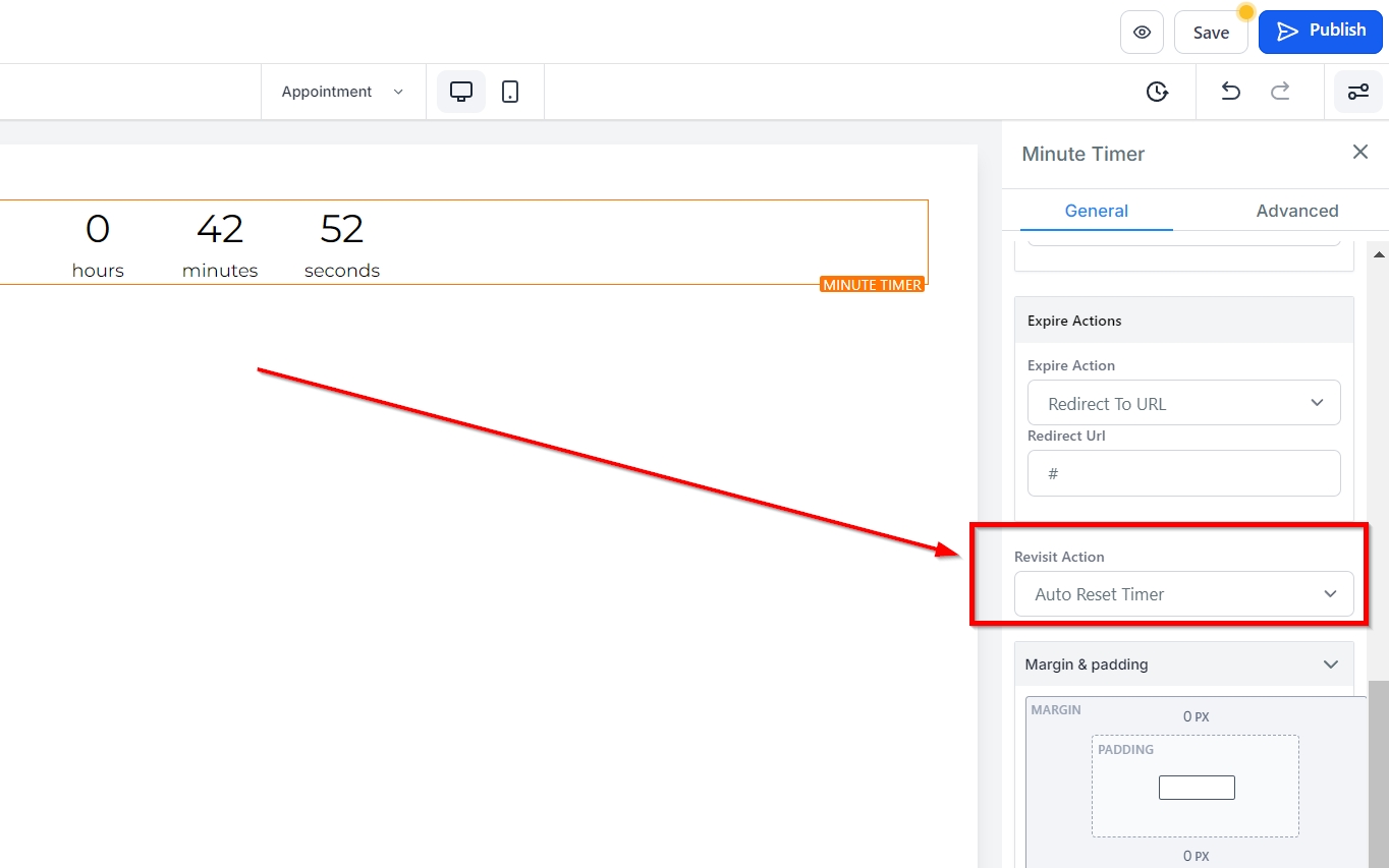 With the Revisit Action feature, you can choose what happens when a user revisits your page after the timer expires. Customize the behavior by setting an auto-reset timer, Hide/ show an element, or auto-expire for X days.
