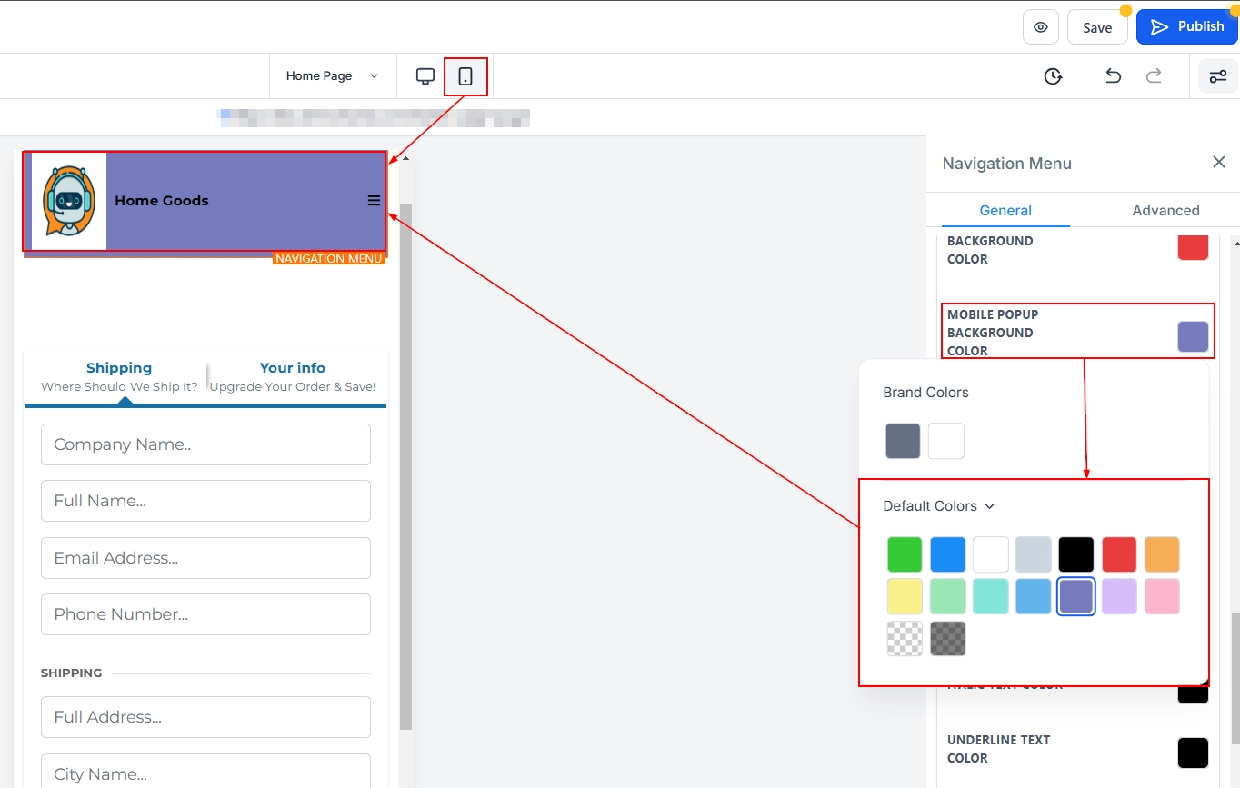 To modify the mobile background color of your navigation menu, click the desired color option. This enables you to customize the appearance of your menu for mobile devices, enhancing the readability and user experience.