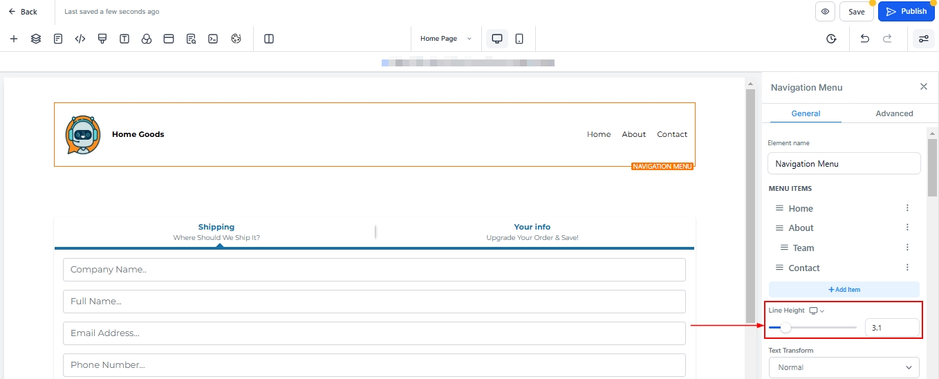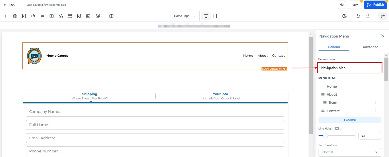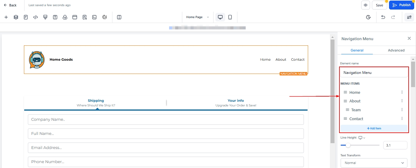 The Menu Items feature enables you to include essential navigational options such as Home, About, Team, and Contact Menus on your website's navigation bar. You can add more options by clicking on the "+ Add Item" button.