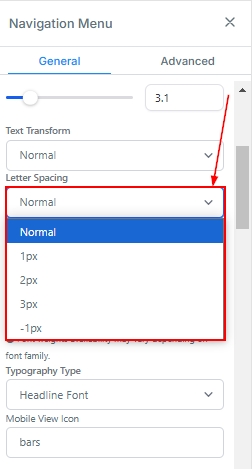 Menu Item Spacing: In the Menu Item Spacing Options, you can adjust the spacing of your menu items. To do this, simply move the bar to increase the number until you achieve the desired spacing. You can also input a desired number into the box to ensure your element is spaced accordingly.