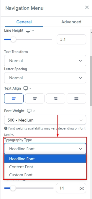 The Typography Type dropdown will give you options for the font of your navigation bar. You can choose to use the headline or content font that you set up in settings or choose a custom font. With the custom font option, you will then be able to select from a variety of fonts with an additional dropdown.