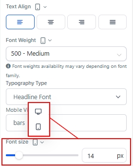 Adjust the font size of a particular text/content for both mobile and desktop devices easily by dragging the size bars. This feature enables you to customize the visual appearance of your content for optimal user experience. You can preview the mobile font size to ensure it is formatted correctly by toggling the mobile view in the top menu bar of the builder.