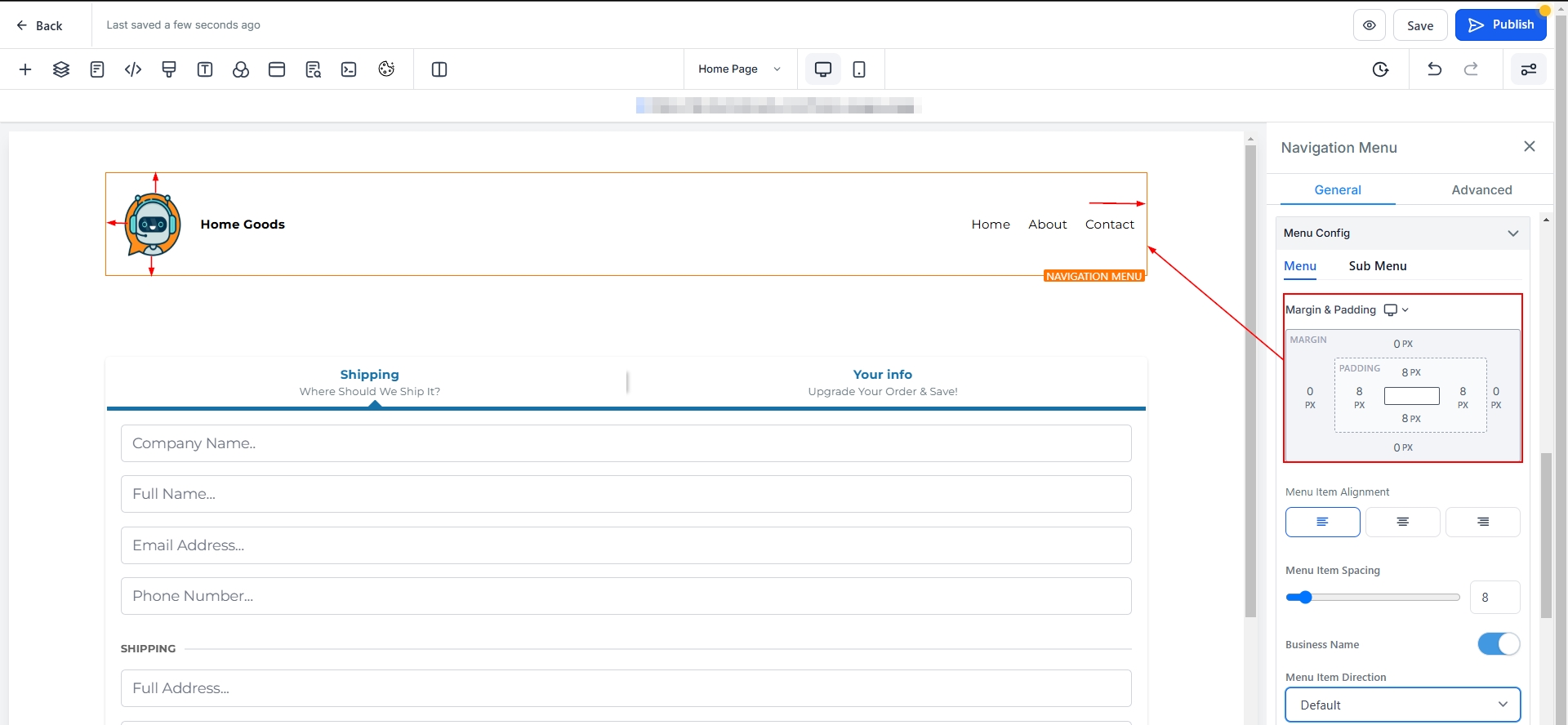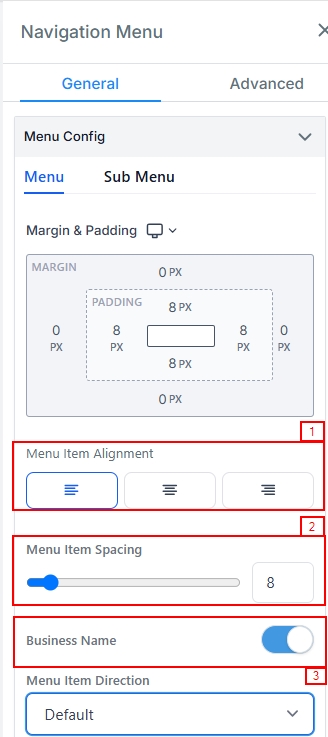Menu Item Alignment: This feature helps you control the overall layout and spacing of the items to ensure your navigation menu is both visually appealing and functional.
