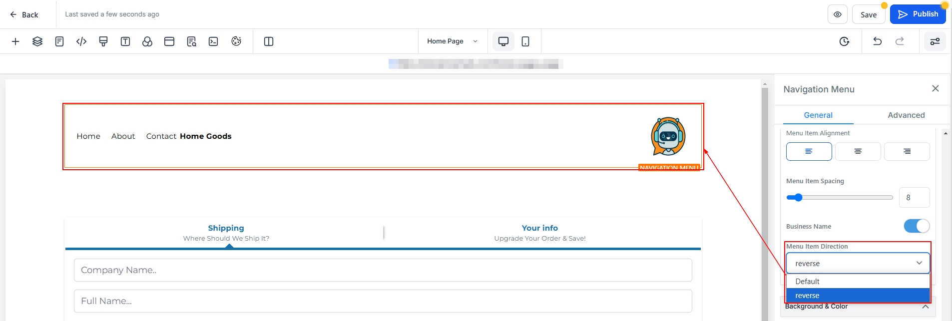 Menu Item Direction allows you to choose between displaying your navigation bar in the default or reversing order.