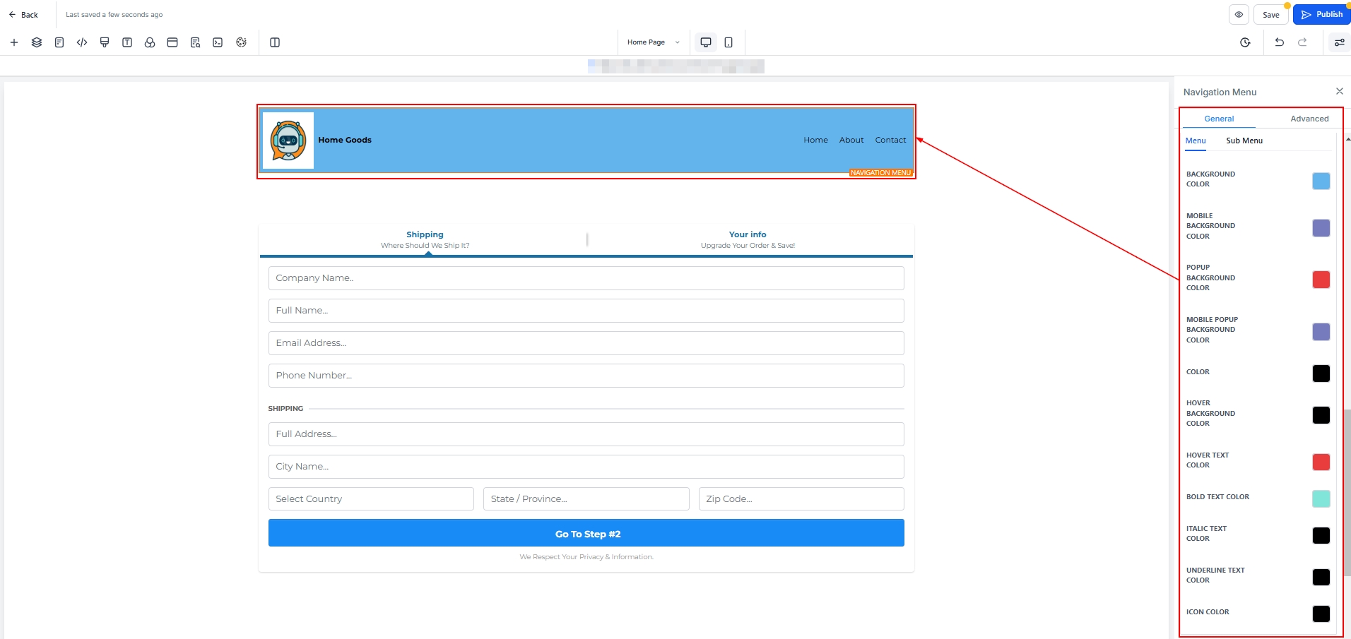 The navigation menu element will add a navigation menu to the top of your funnel page. This is useful for linking to different sections of the page or linking to other pages in your funnel. When you add the navigation menu element, you will have editing options on the left-hand side.
