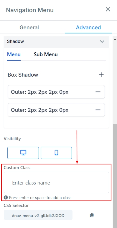 The Custom Class feature allows you to input your specific class to your content. Press enter or space to add a class.