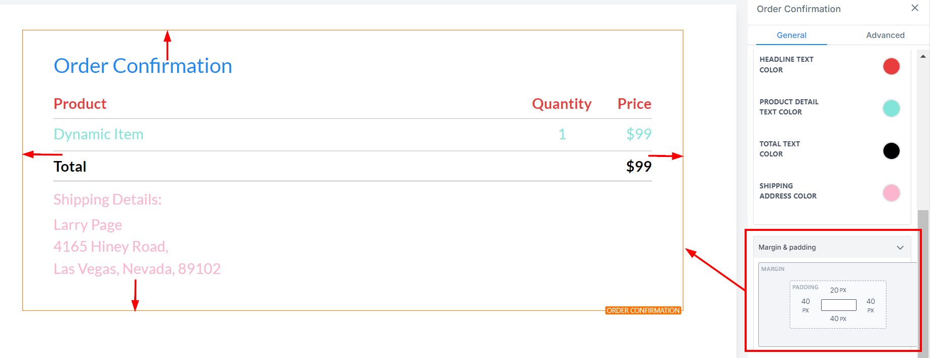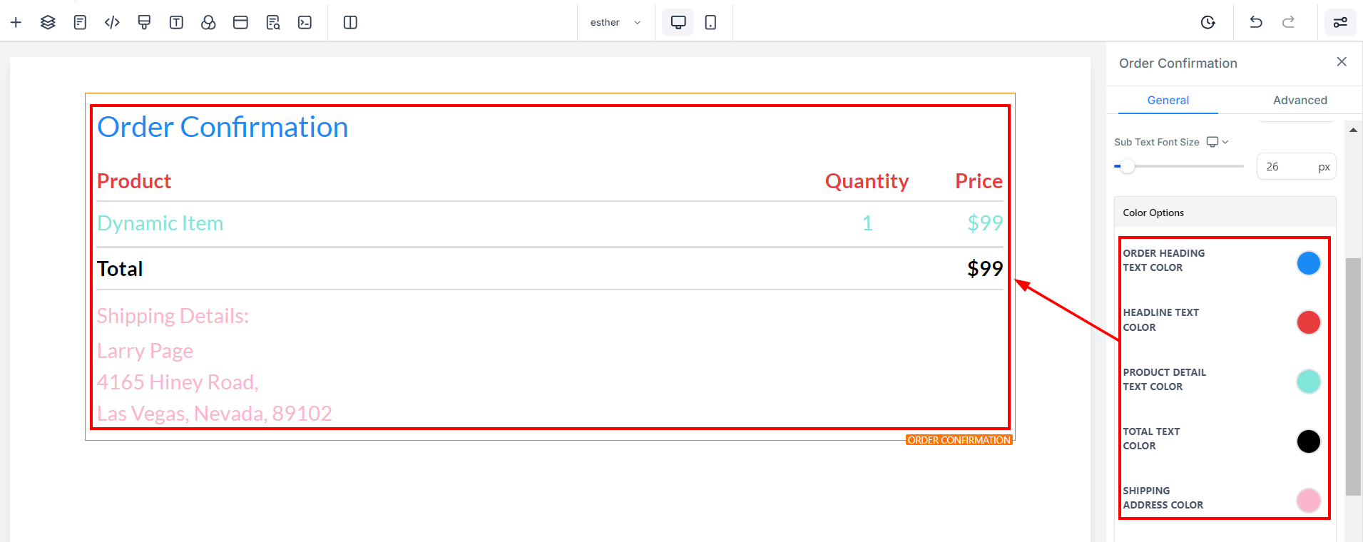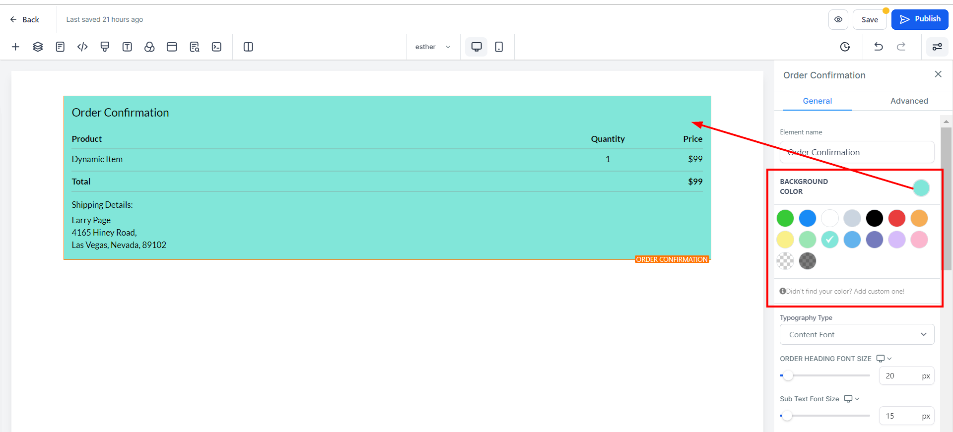 To modify the background color of your order confirmation element, select the color icon and choose a color from the available options.