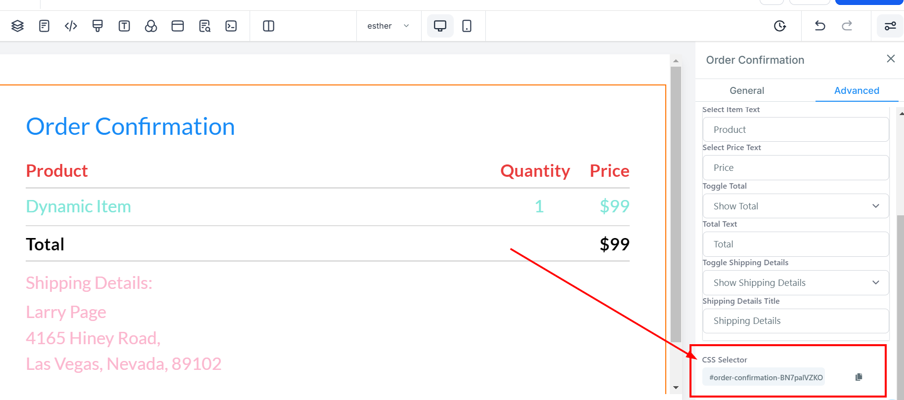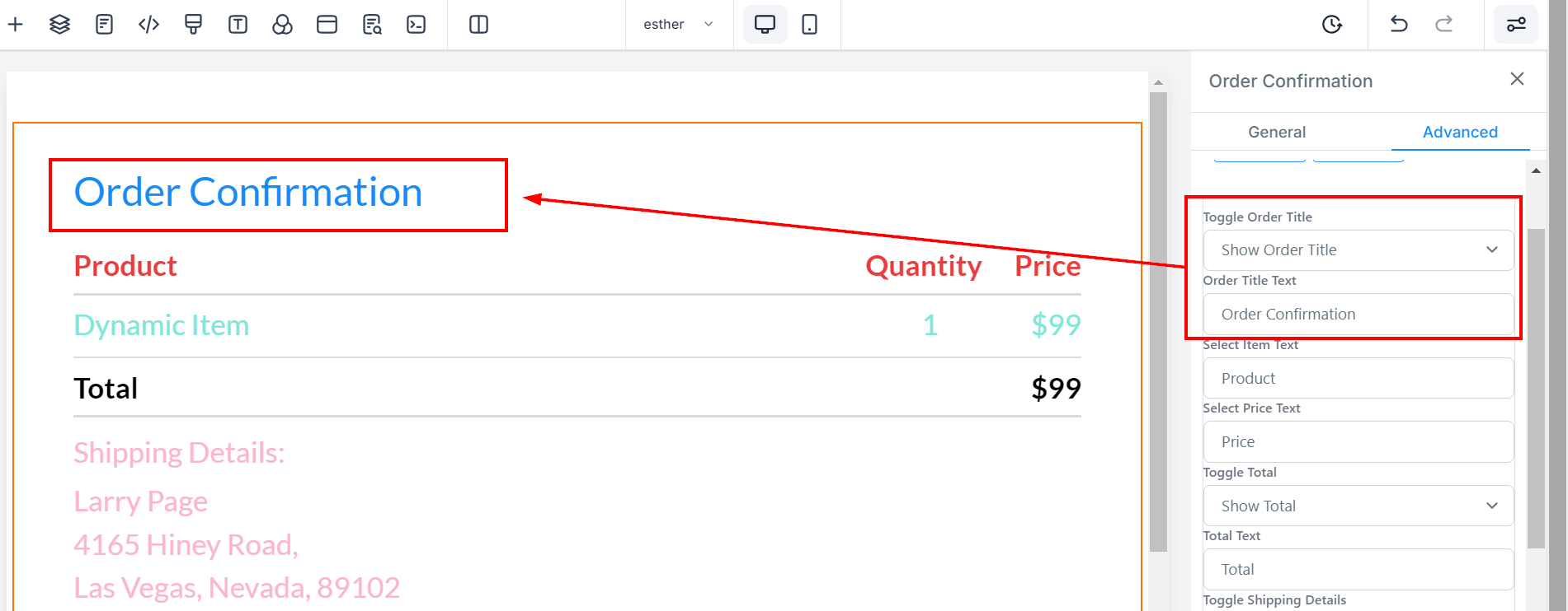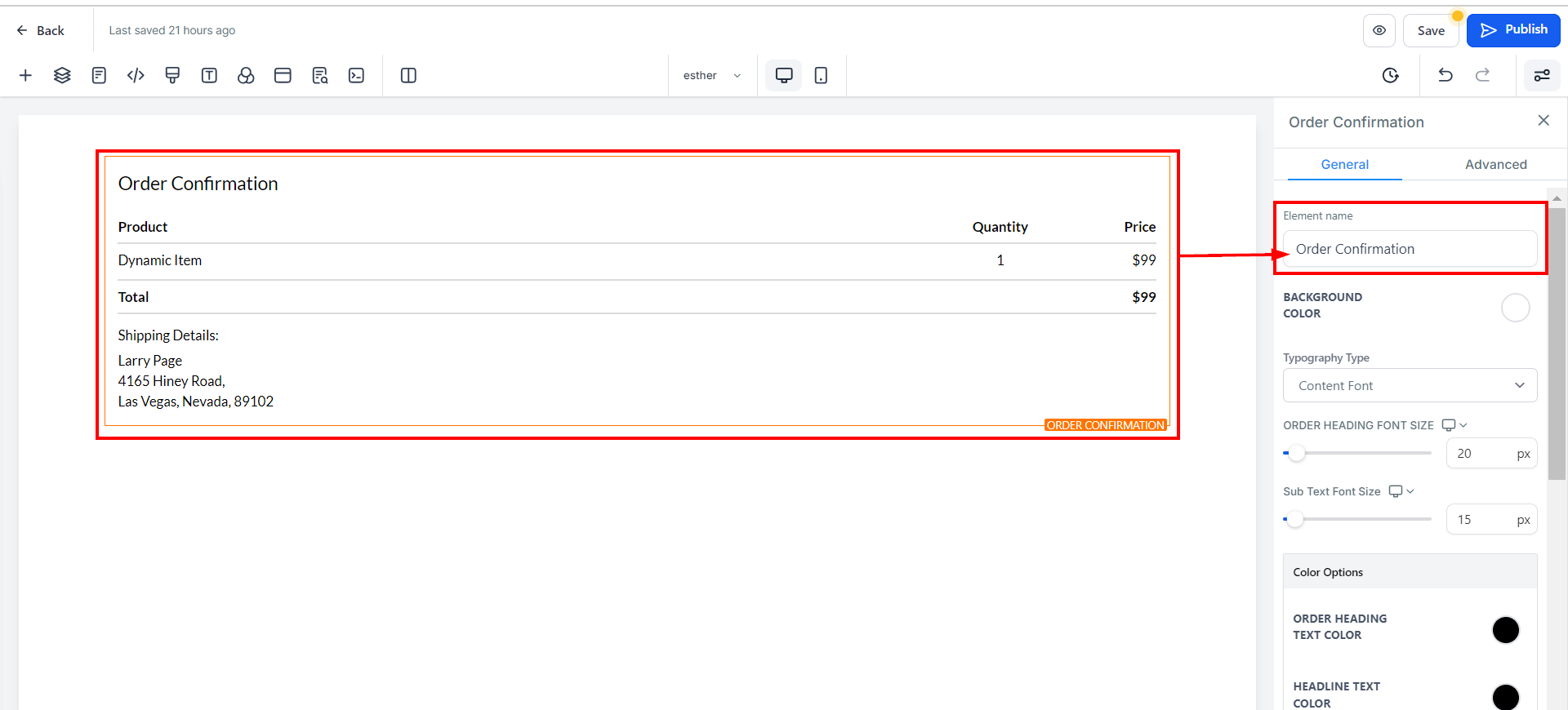 The Order Confirmation element allows you to add an order confirmation to your funnel page. This is useful when taking orders in a previous funnel page, and having a confirmation page be your next funnel step. When you add this element, you will notice a variety of customization options on the left-hand side of the builder.