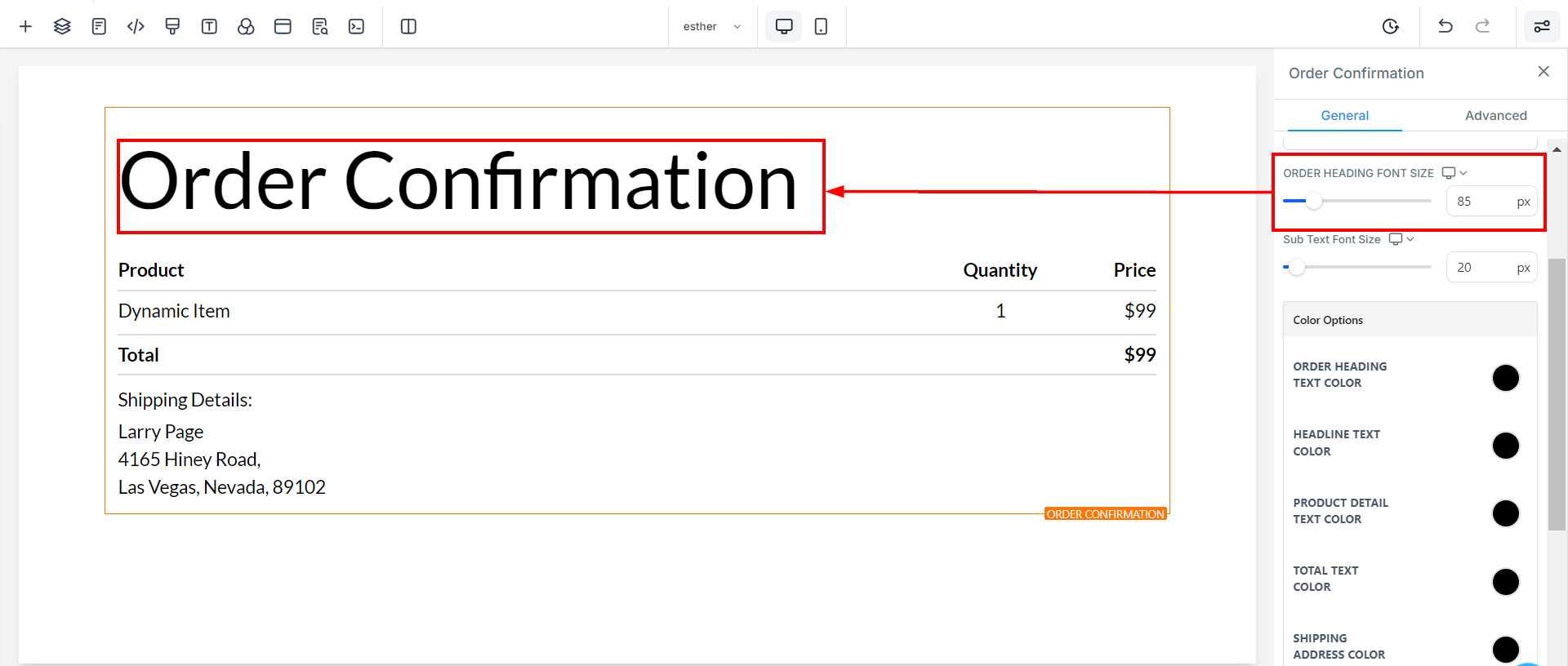 You can adjust the mobile and desktop font sizes of your order heading by adjusting the size bars or typing a number into the given field.