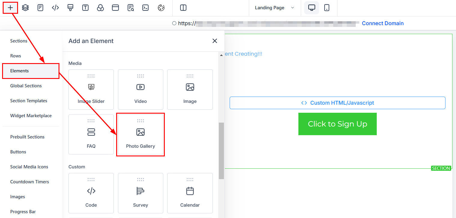 Navigate to the website or funnel builder and locate the Photo Gallery element in the left sidebar.
