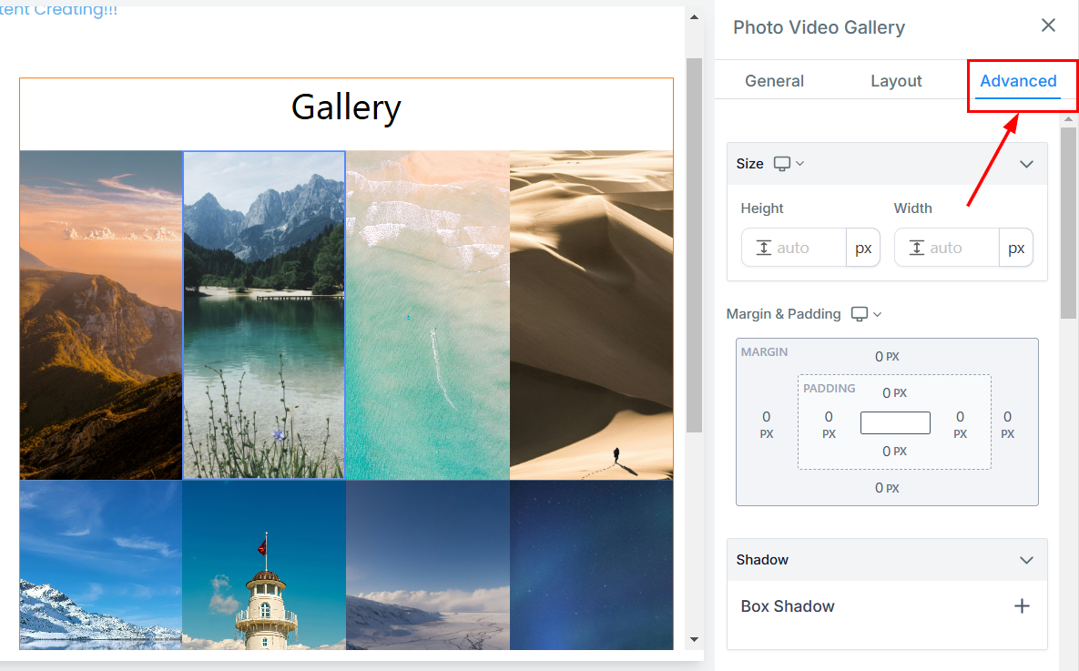 In the Advanced section, you can adjust the Size, Margin & Padding, Shadow, General Settings, Watermark, and Custom Class Settings of the Photo Gallery.