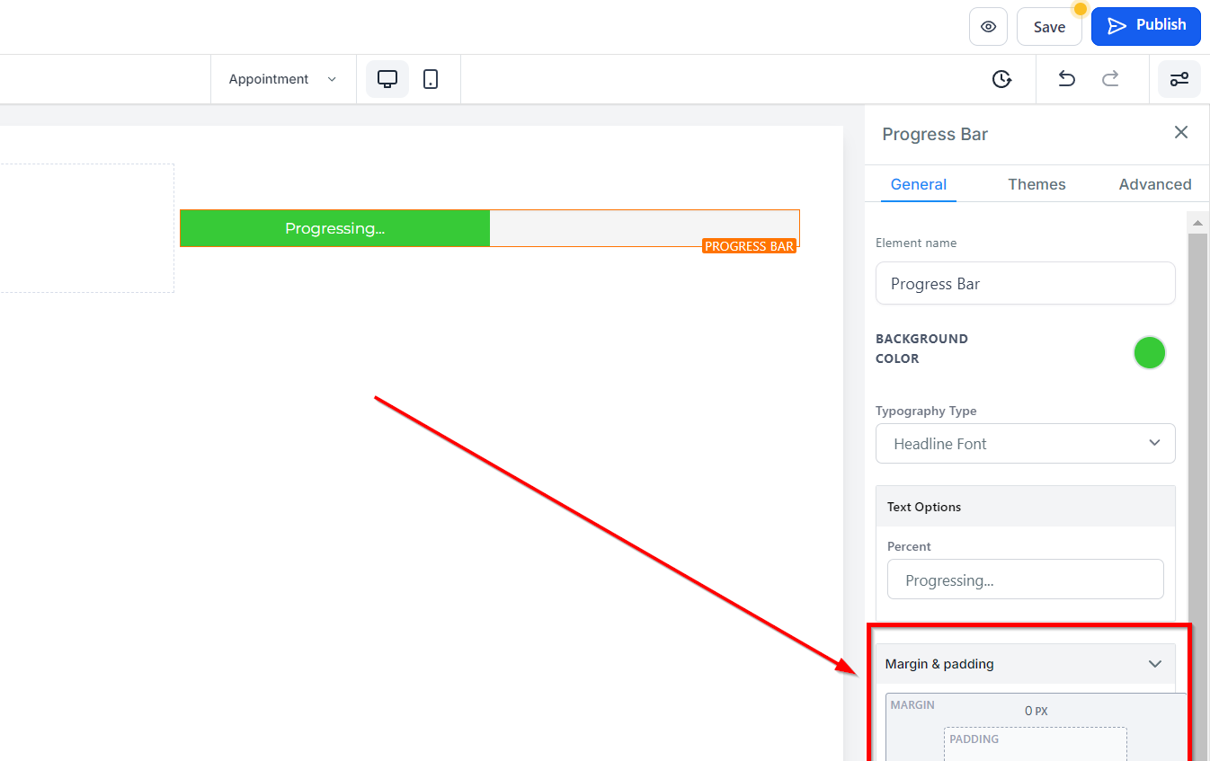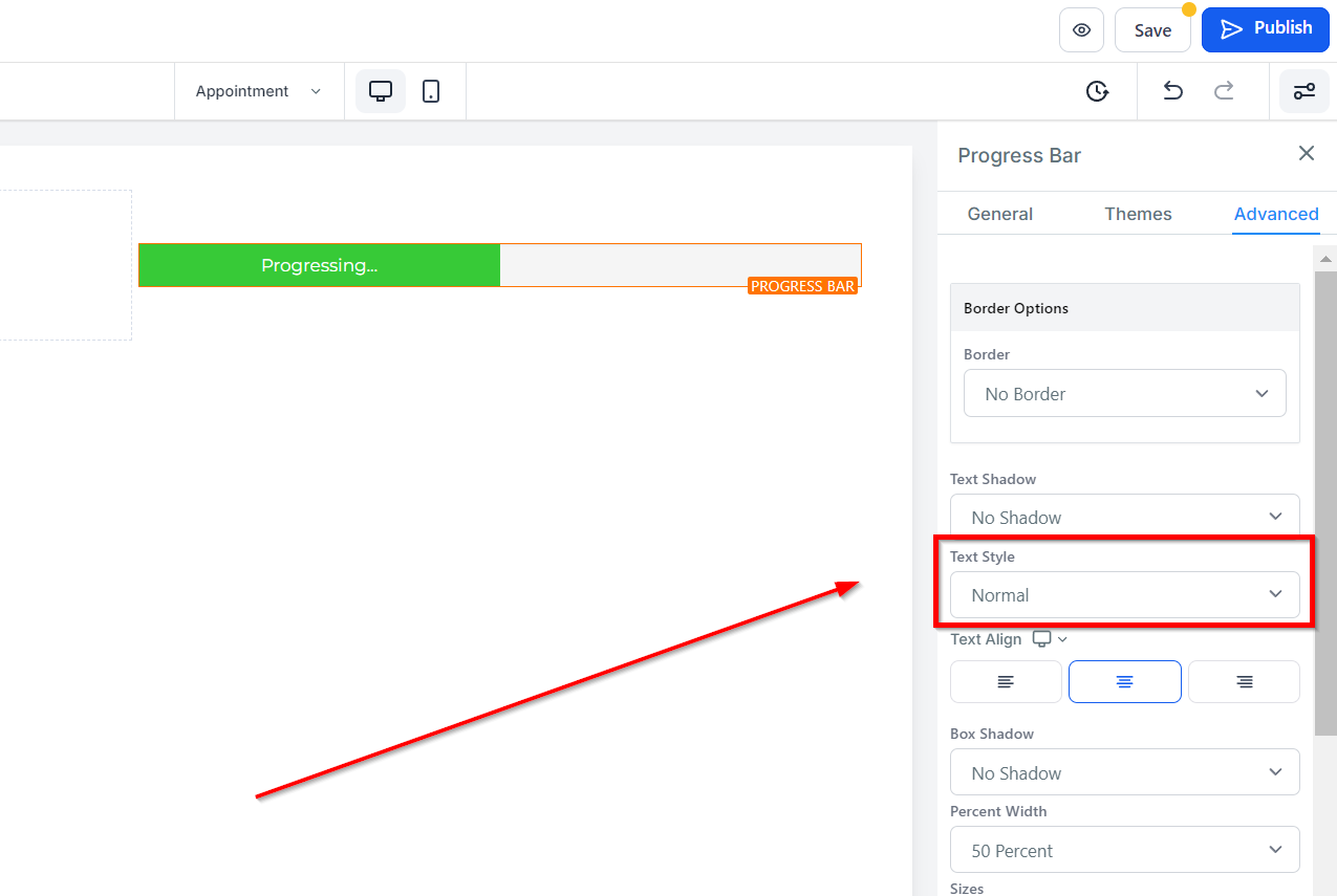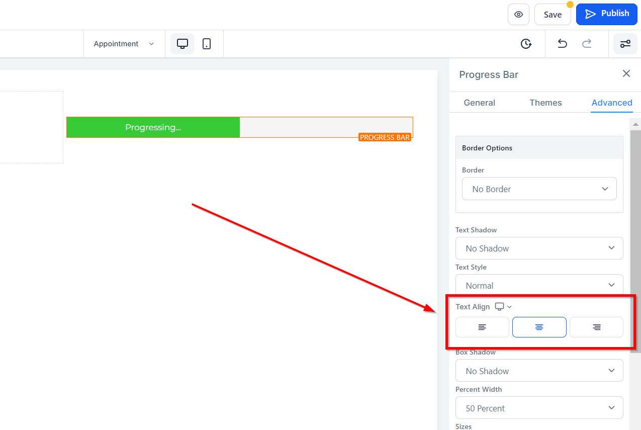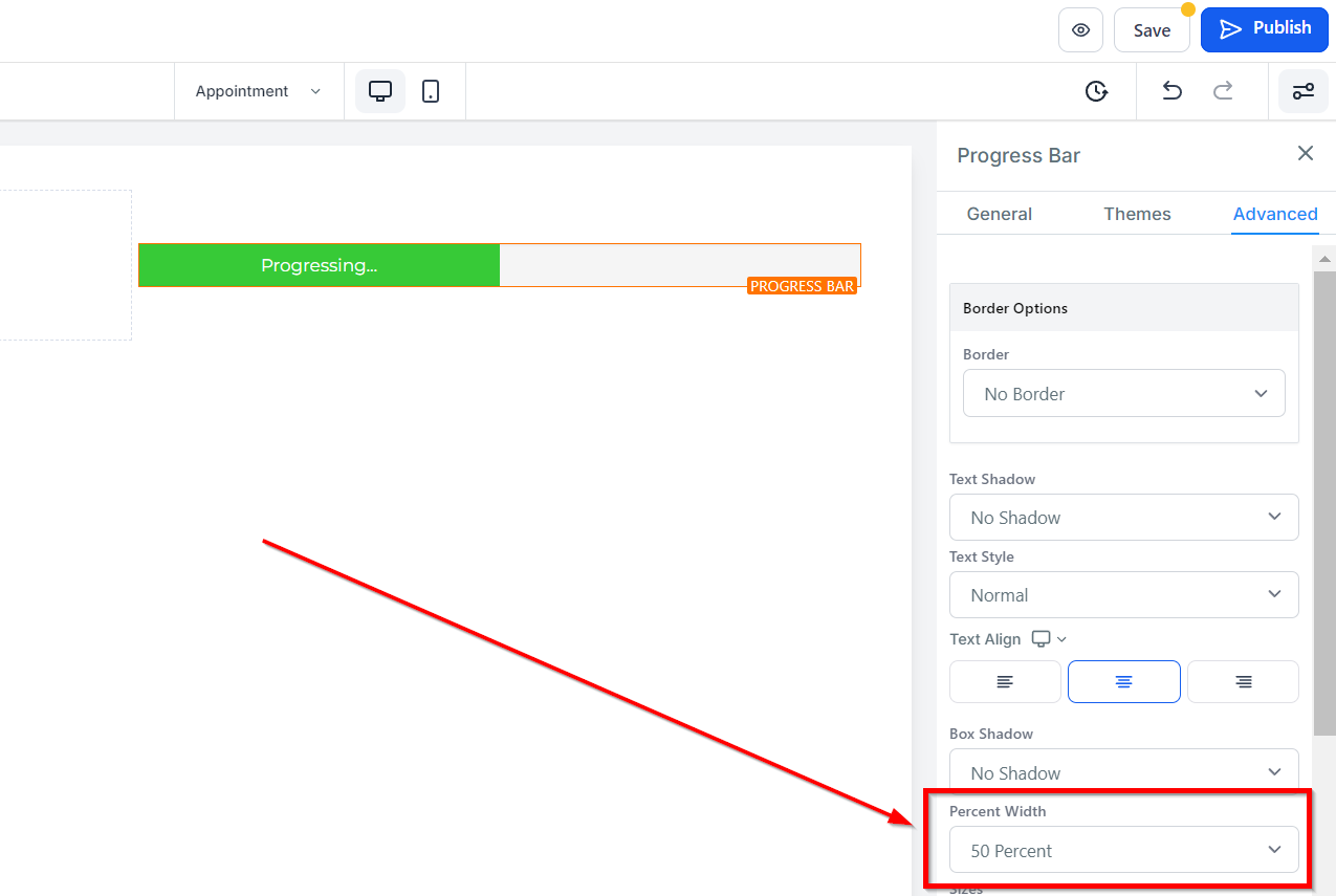 With the Percent Width dropdown, you can choose how wide you would like your progress bar to be within the element box. You can choose from 0 percent up to 100 percent.