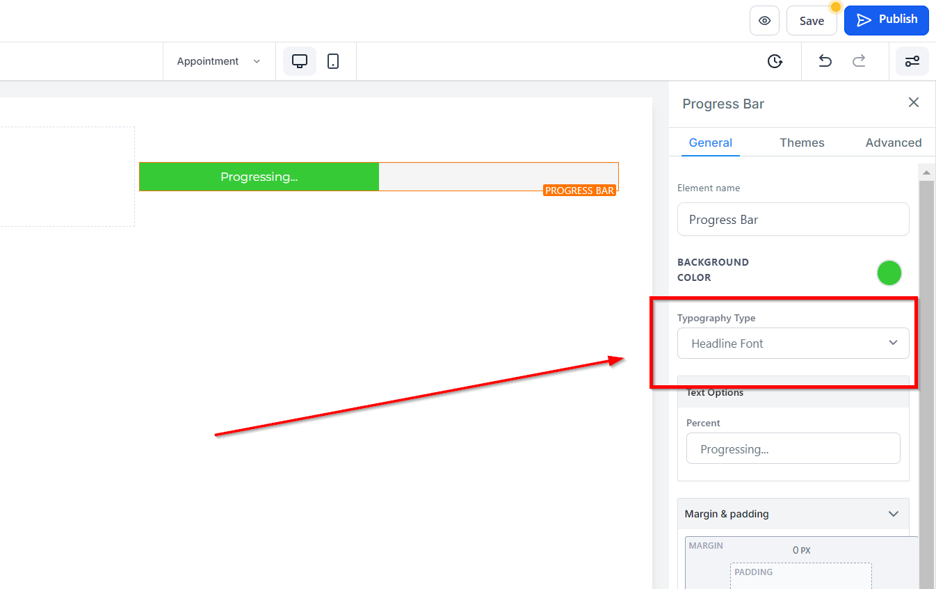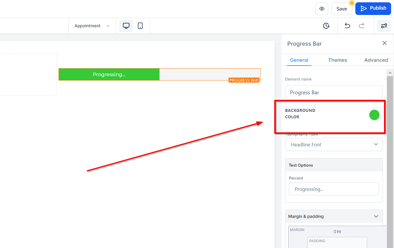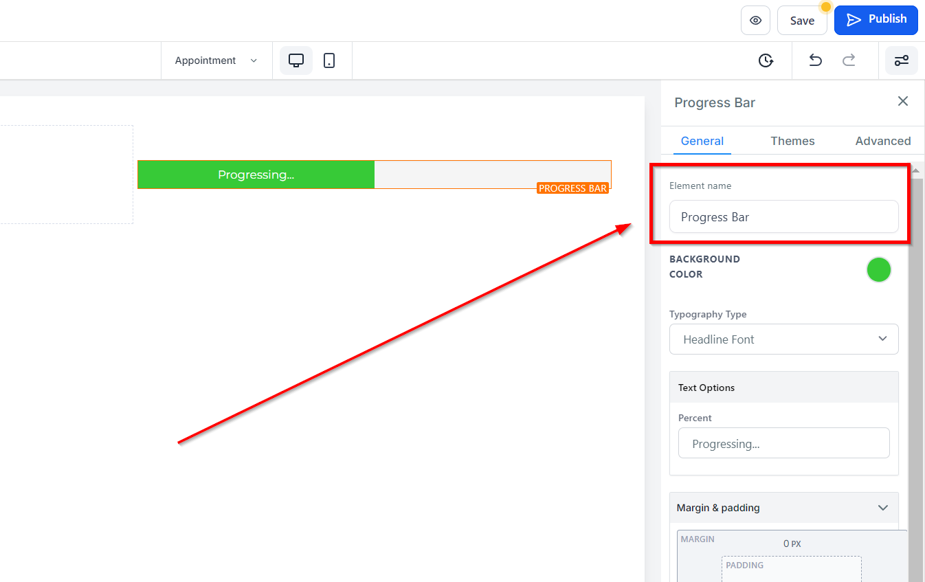 With the Percent Width dropdown, you can choose how wide you would like your progress bar to be within the element box. You can choose from 0 percent up to 100 percent.