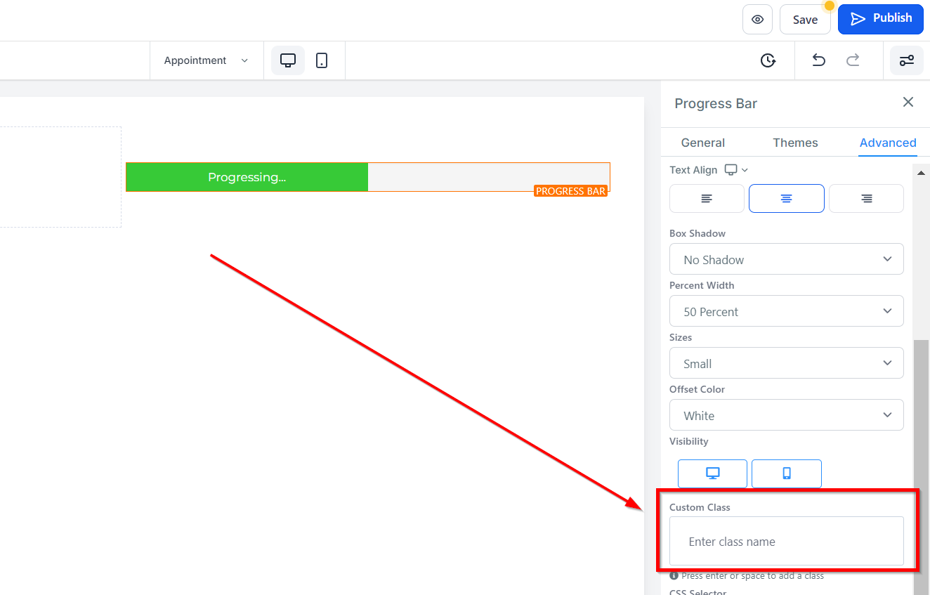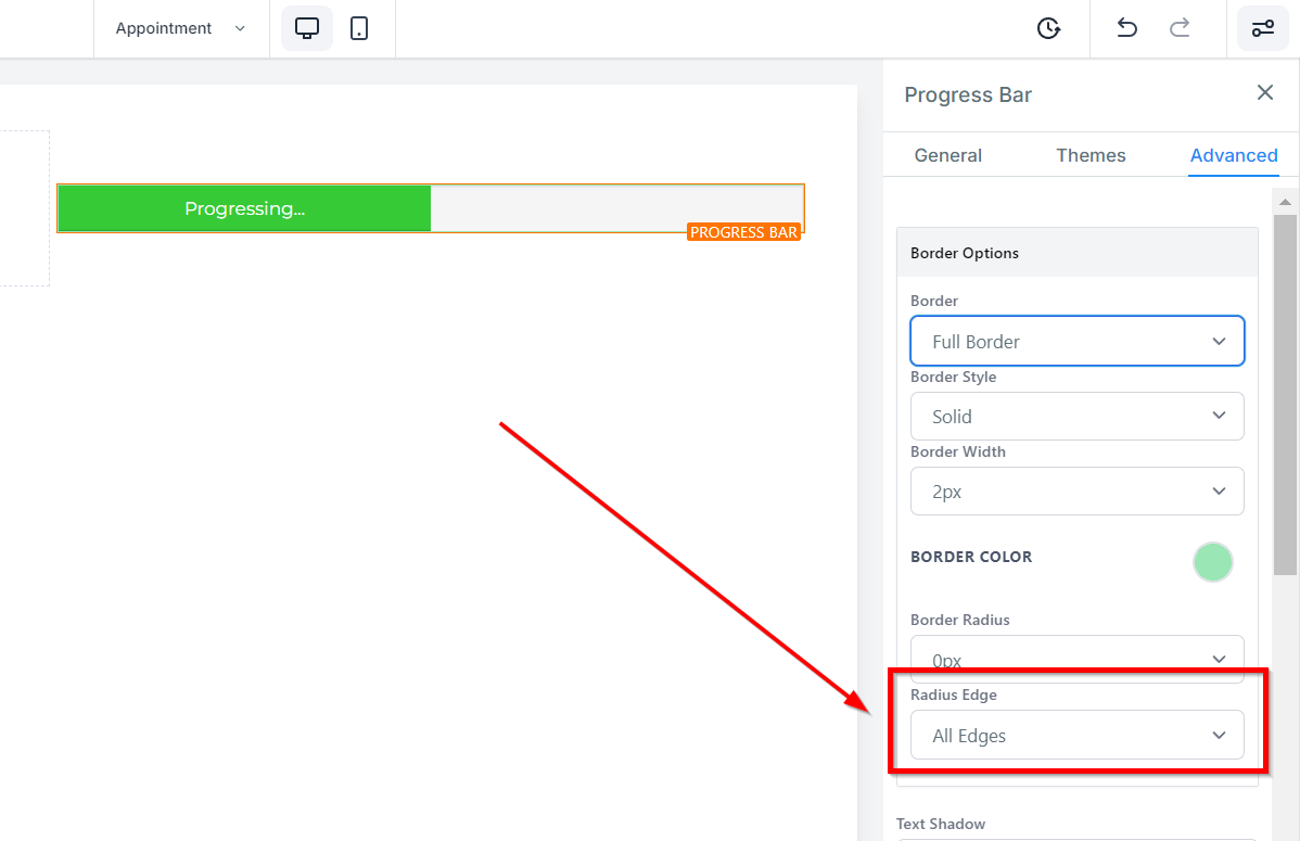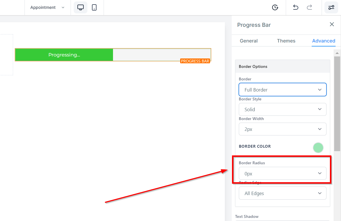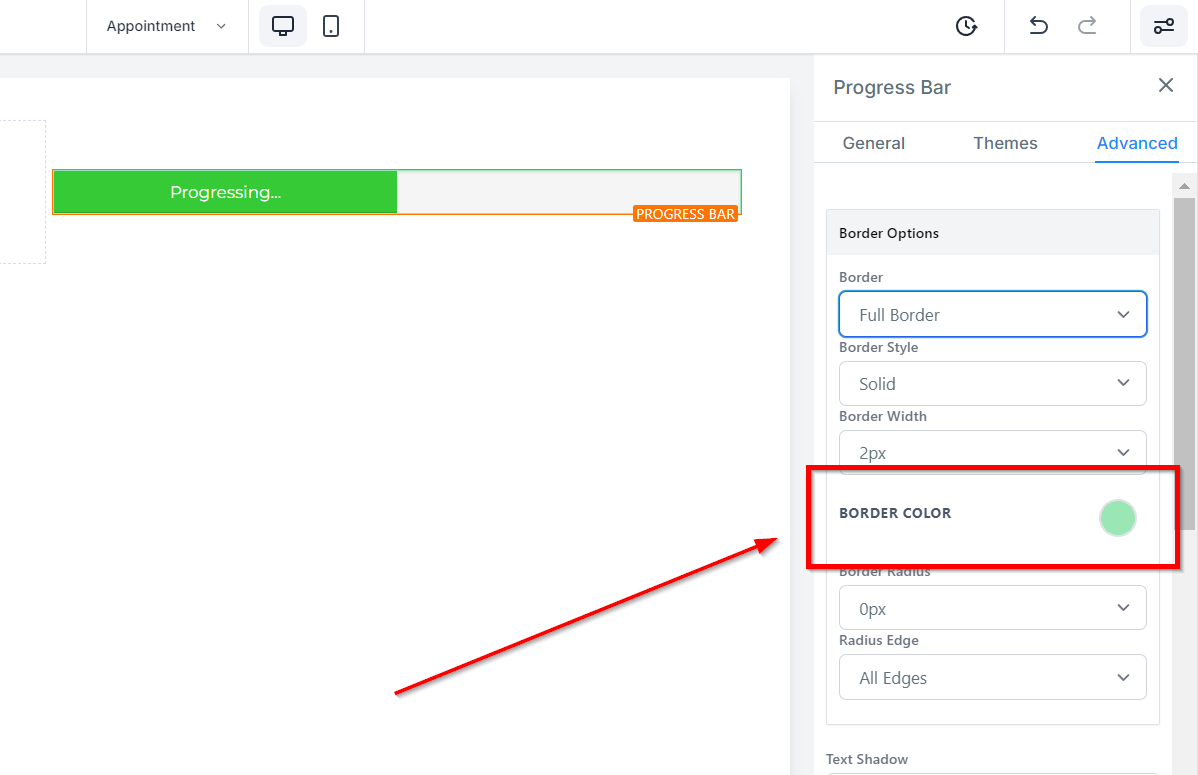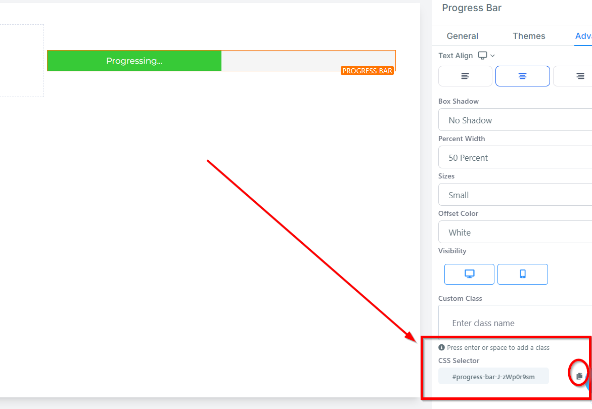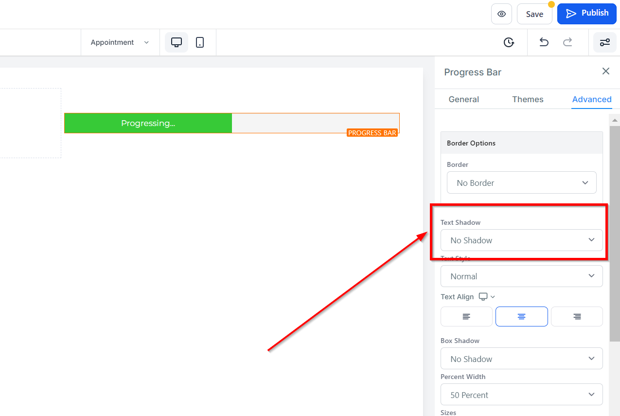 If you would like to add a box shadow around your progress bar, select the dropdown and choose from your options of drop shadow or inner shadow. You will see various intensities of shadows, so play around with them to see which one fits your needs the best.