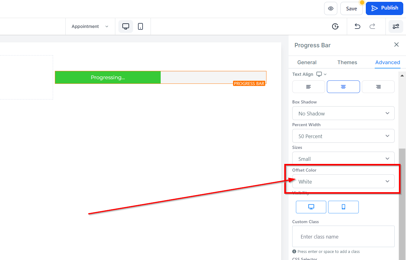 If you would like to set the offset color of your progress bar, which fills in the remaining section of your element box (if you don’t have your progress bar set at 100%), you can choose from the options in the dropdown menu. Here you can select the offset color to be white, transparent white, black, or transparent black.
