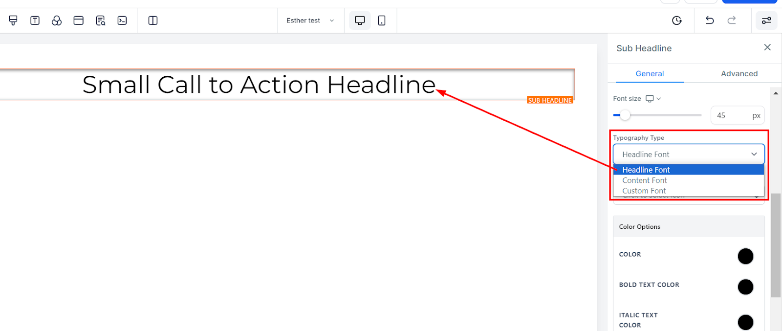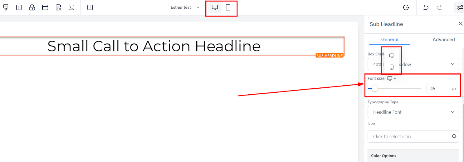 To change the font size for mobile and desktop devices, modify the size bars for each text or content element. Switch between mobile and desktop views at the top left corner of your funnel builder to preview how your edits will appear on each platform.