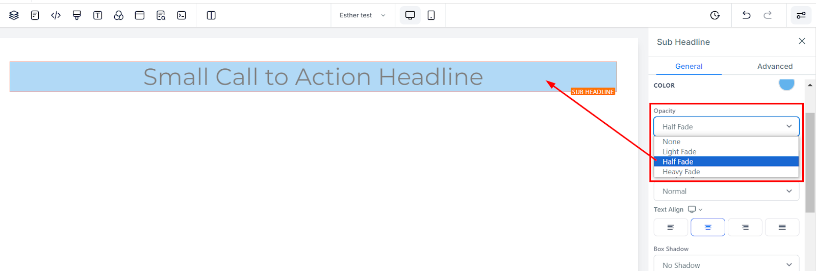 To customize the transparency level in your element box content or text, utilize the opacity adjustment feature. You can choose from various levels of fading, such as None (completely transparent), Light, Half, and Heavy Fade (increasing opacity). This flexibility enables you to tailor the visual effect of your content to suit your preferences, creating a unique and eye-catching appearance.