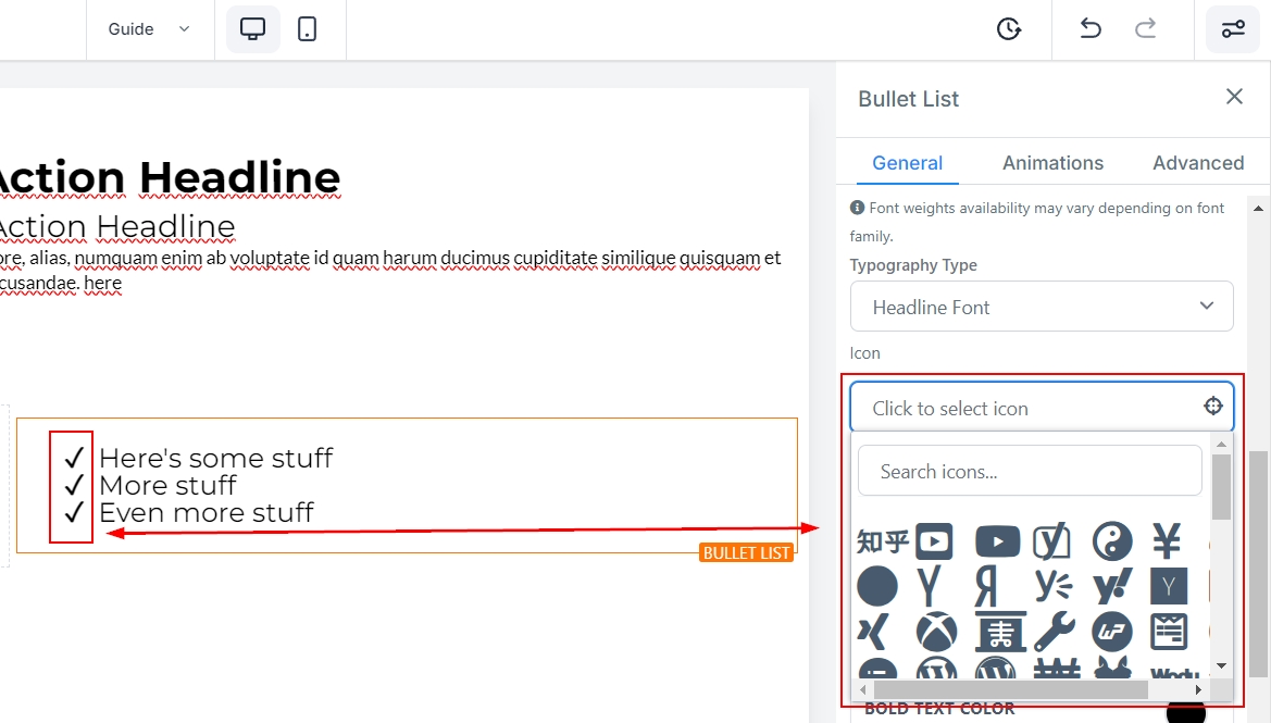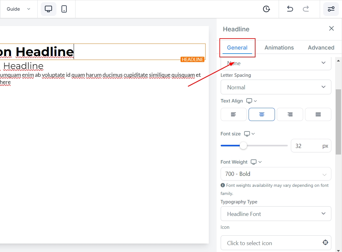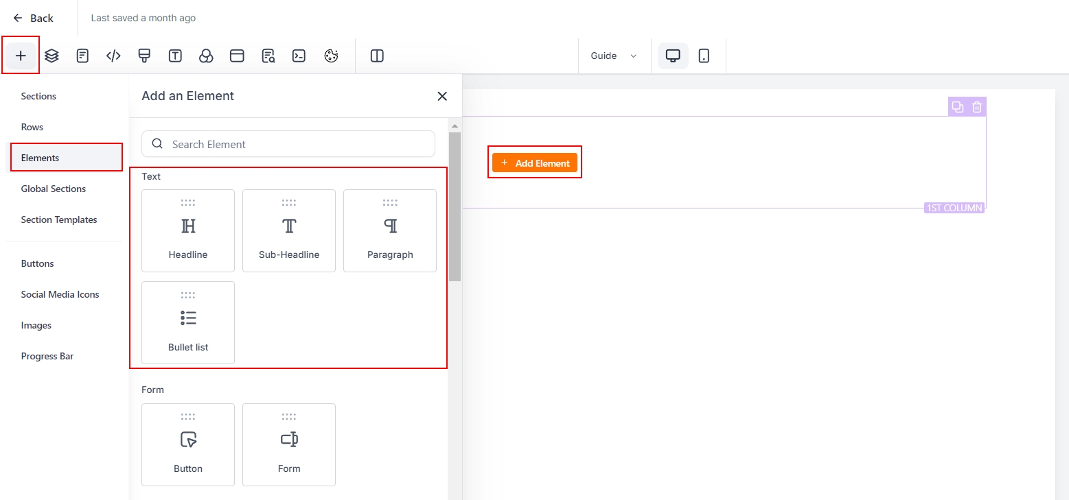Inside the builder click the plus sign button, this will open your element menu for you to drag and drop your text element. The size order from larger to smallest is Headline, Sub-Headline, Bullet list, and Paragraph.
