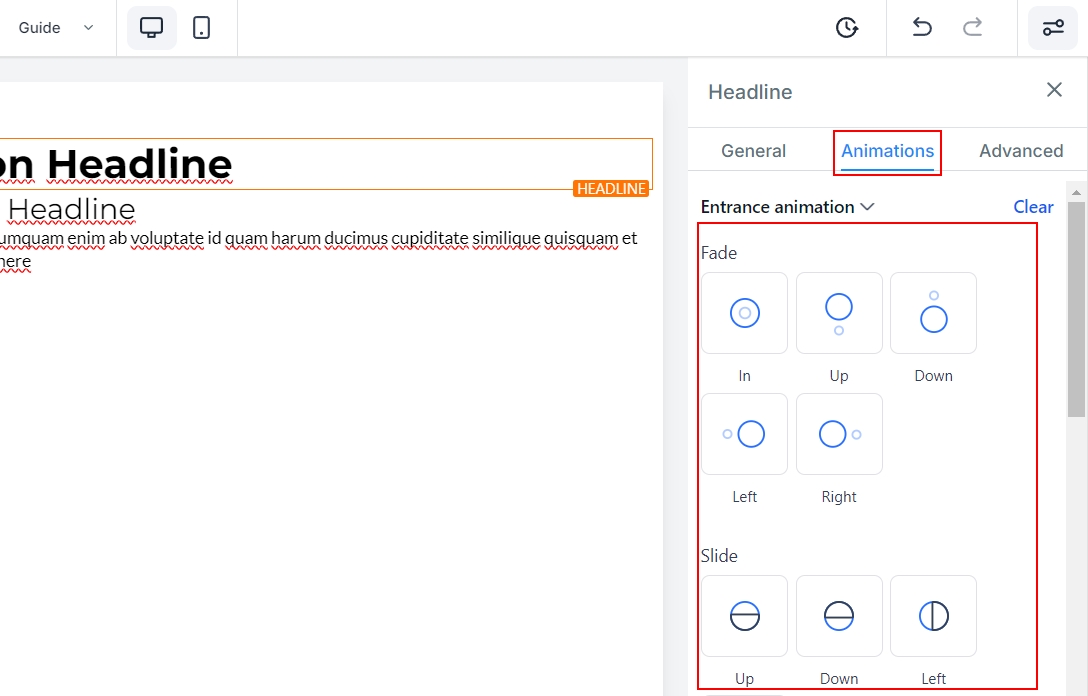 This feature enables you to enhance your text by adding dynamic animations and transforming static content into eye-catching, engaging elements that activate upon entering your funnel or website.