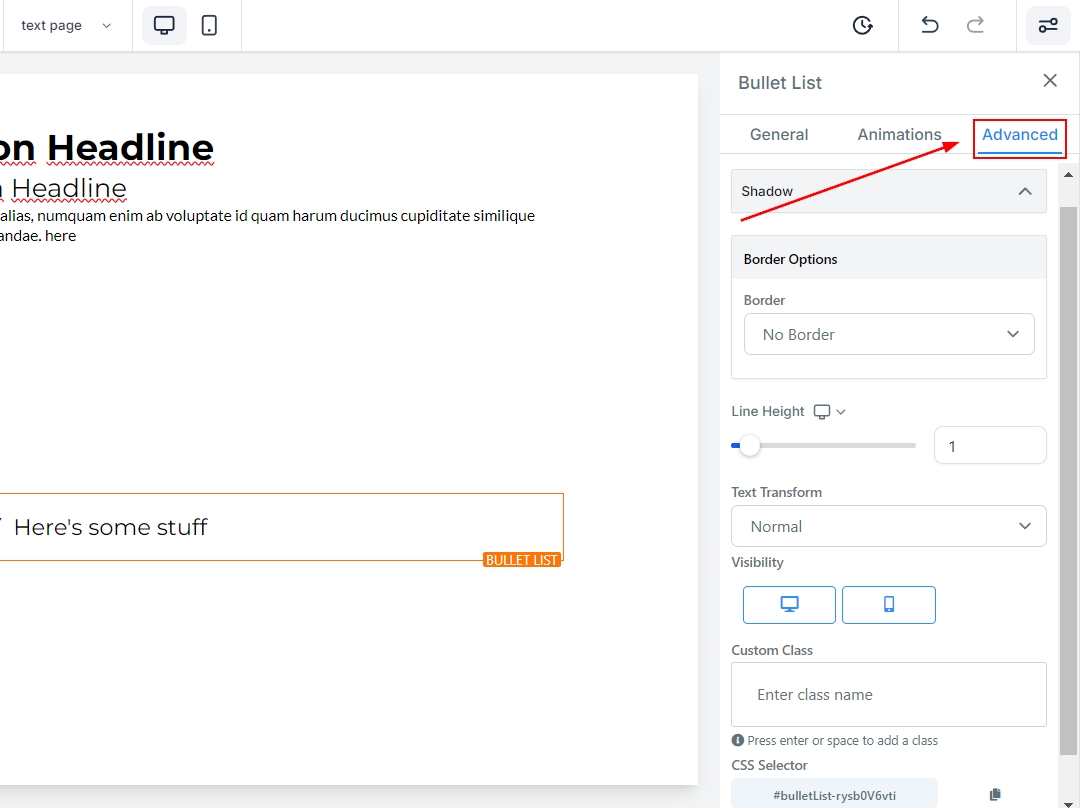 Options within this section include Box Shadow, Border, Line Height, Text Transform (for text formatting), Custom Class, and CSS Selector.