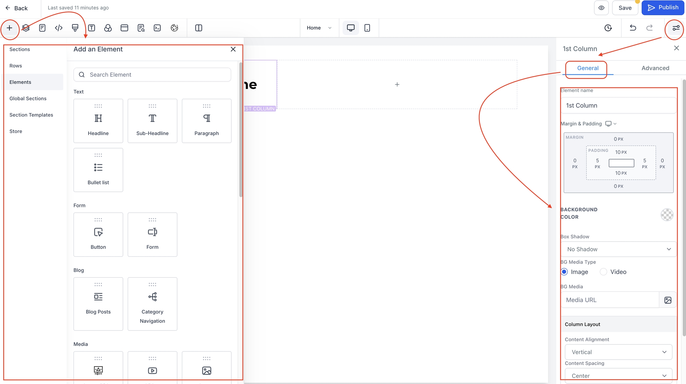 General settings allow you to manage the basic aspects of your web page elements, including their names/titles and spacing options.