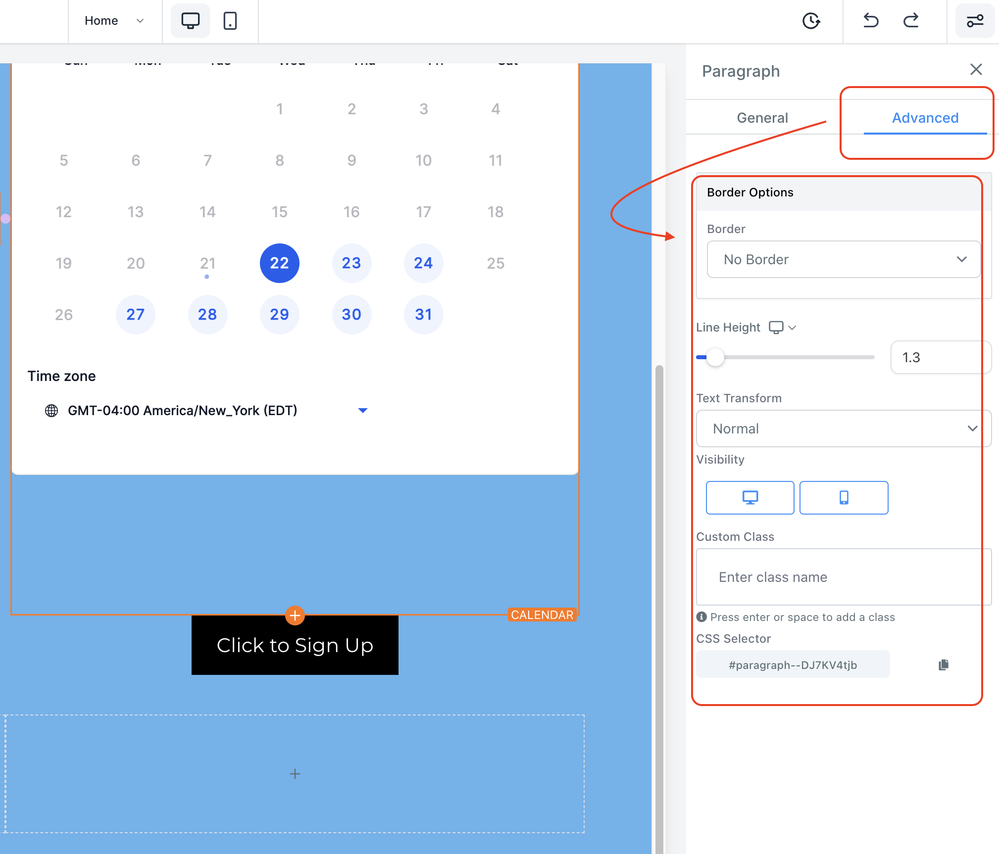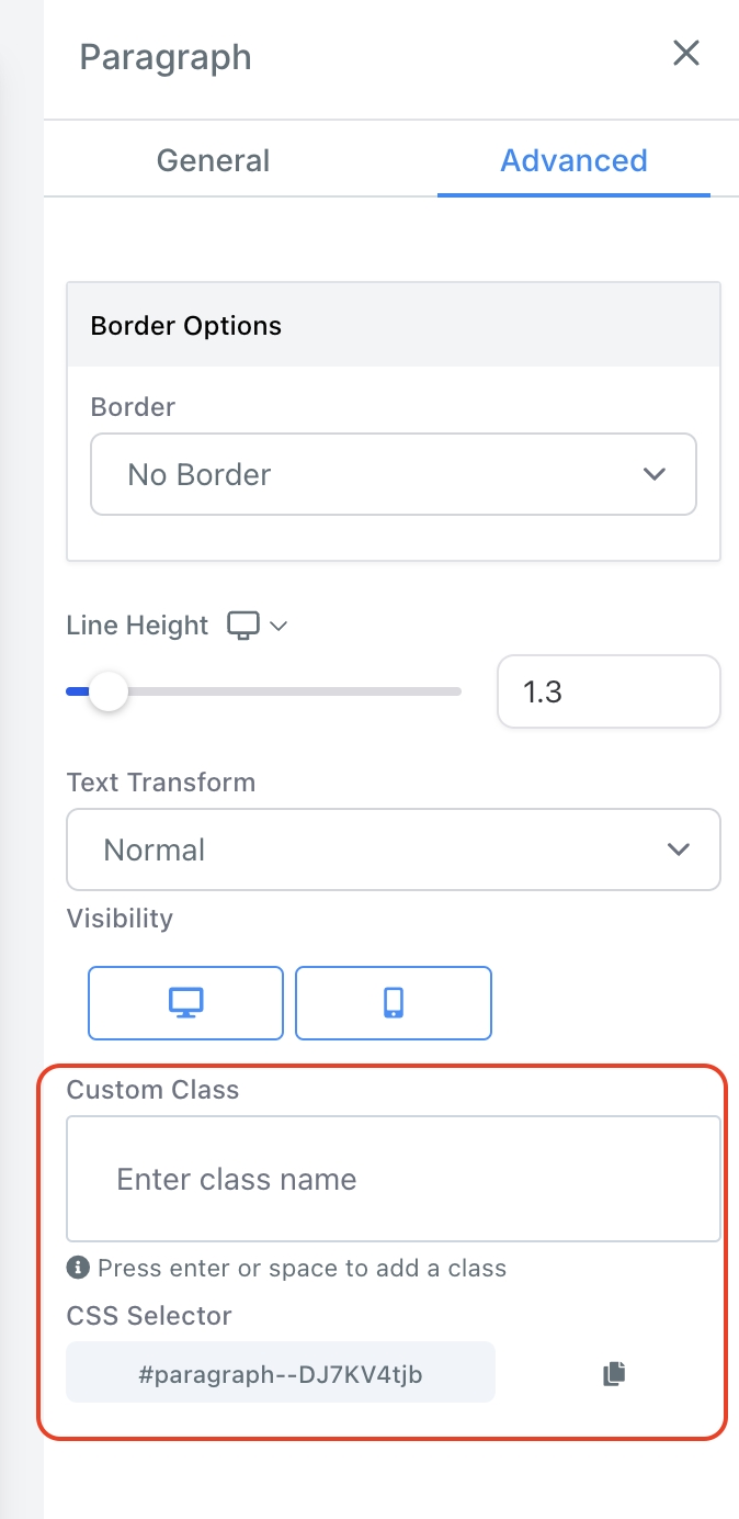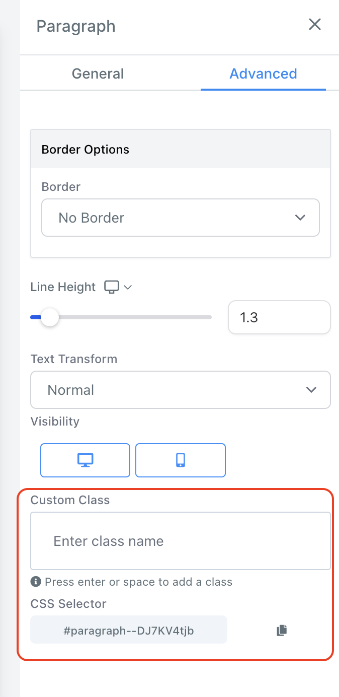 Detailed Explanation:- Visibility: Optimize your web page for desktop or mobile devices by selecting the appropriate visibility option for each element. - Custom Class and CSS Selector: Assign custom class names to elements for specific styling and easily copy CSS Selector codes for consistent styling across your web page.