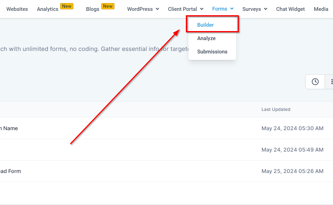 Navigate to the "Sites" section and select "Forms" to access the form builder.