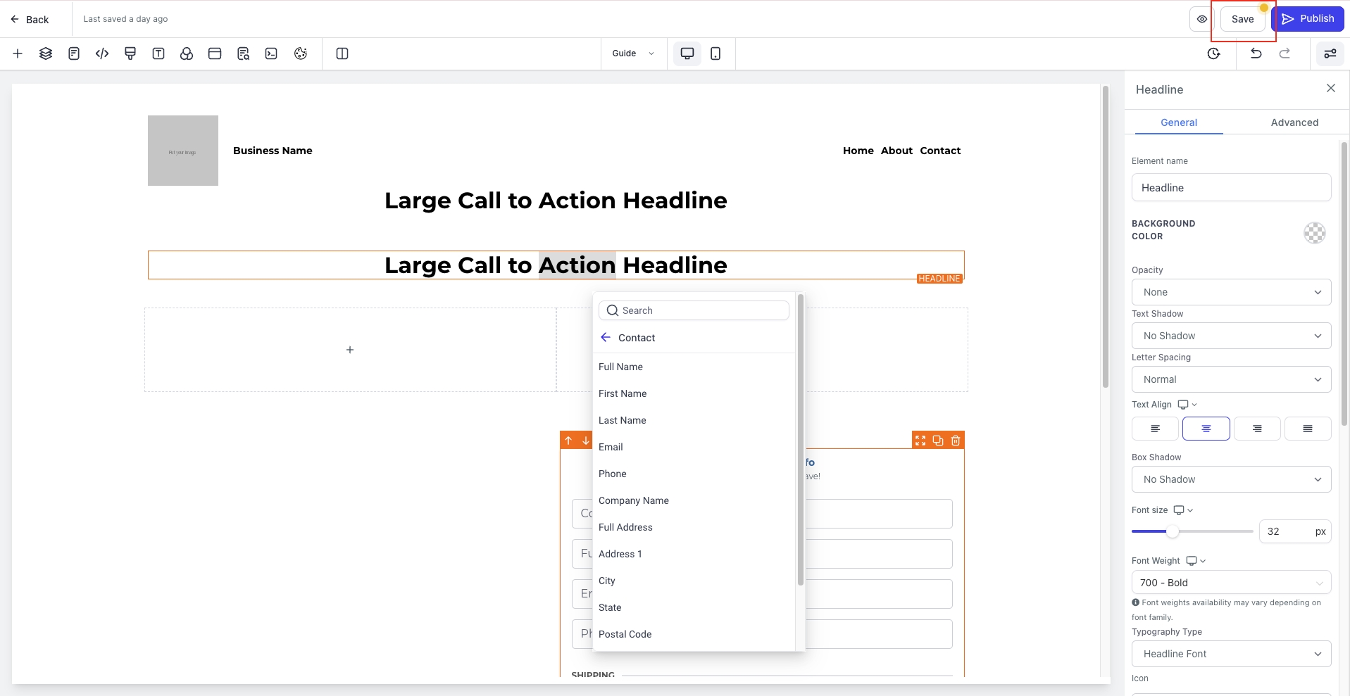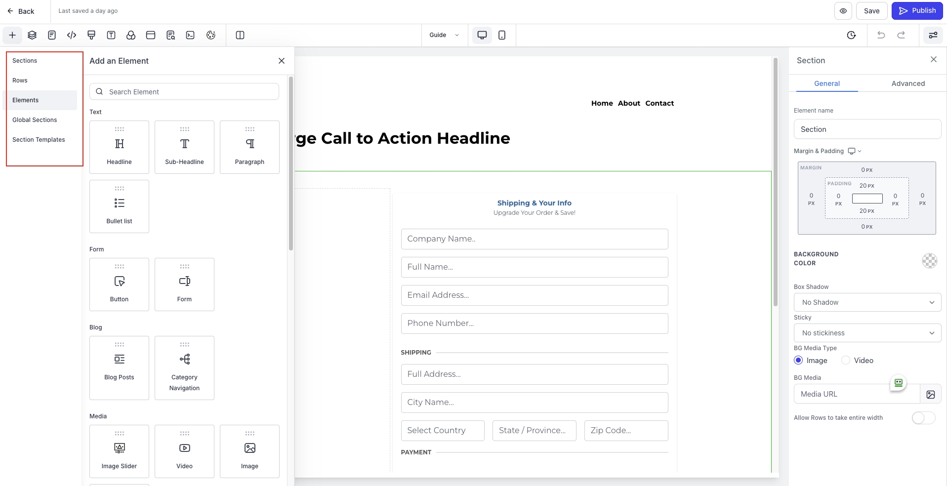 Add sections, rows, columns, and various elements in an intentional order. You may reference other funnels for inspiration.