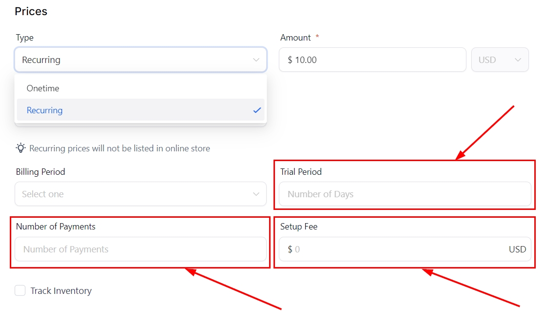 5. Optionally, add a trial period, setup fee, or define a number of payments for recurring payments. For example, if you're selling a monthly subscription service, you might set the price to $100 with a $20 setup fee and a 7-day trial period.