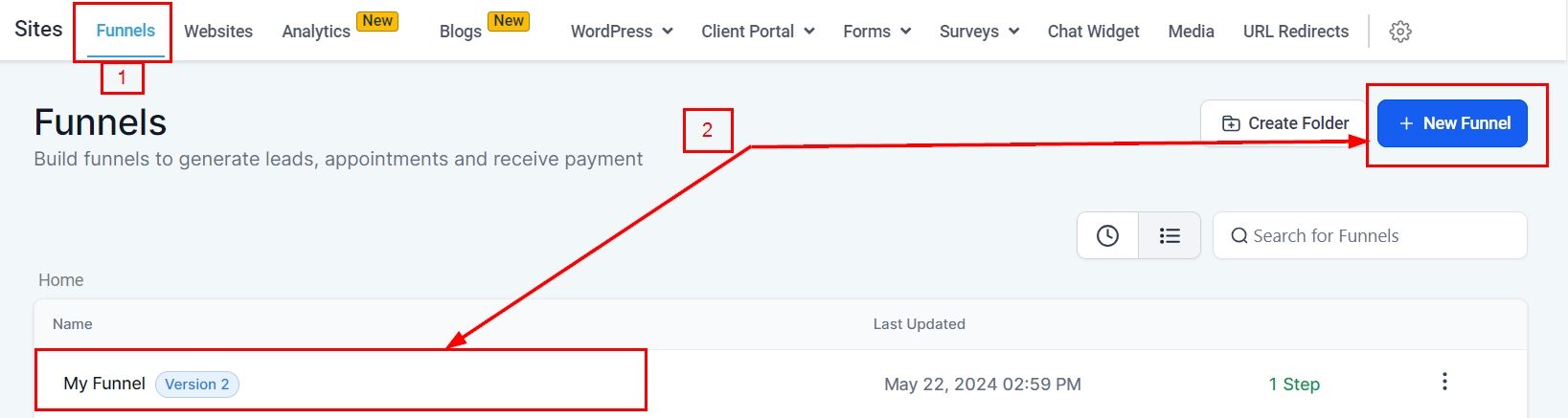 Click on the "plus new funnel" button and name your funnel. Alternatively, click on an existing funnel to update it. In this guide, we will Click on the existing funnel to update it.
