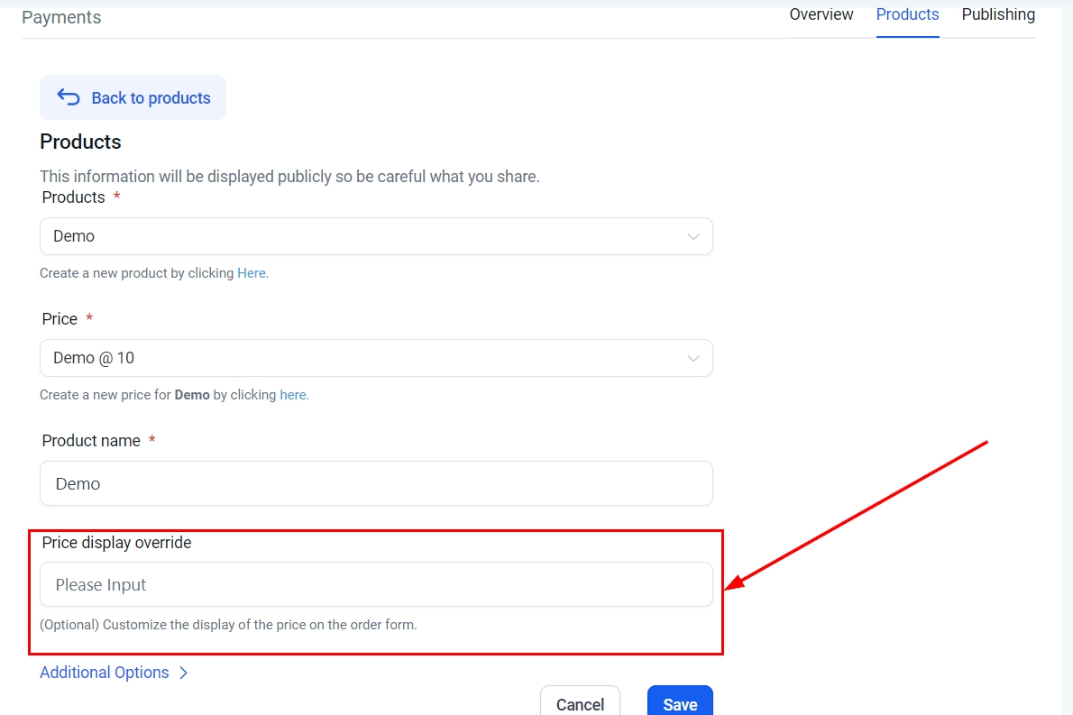 7. Use the Price Display Override field if you need to show custom pricing information.
